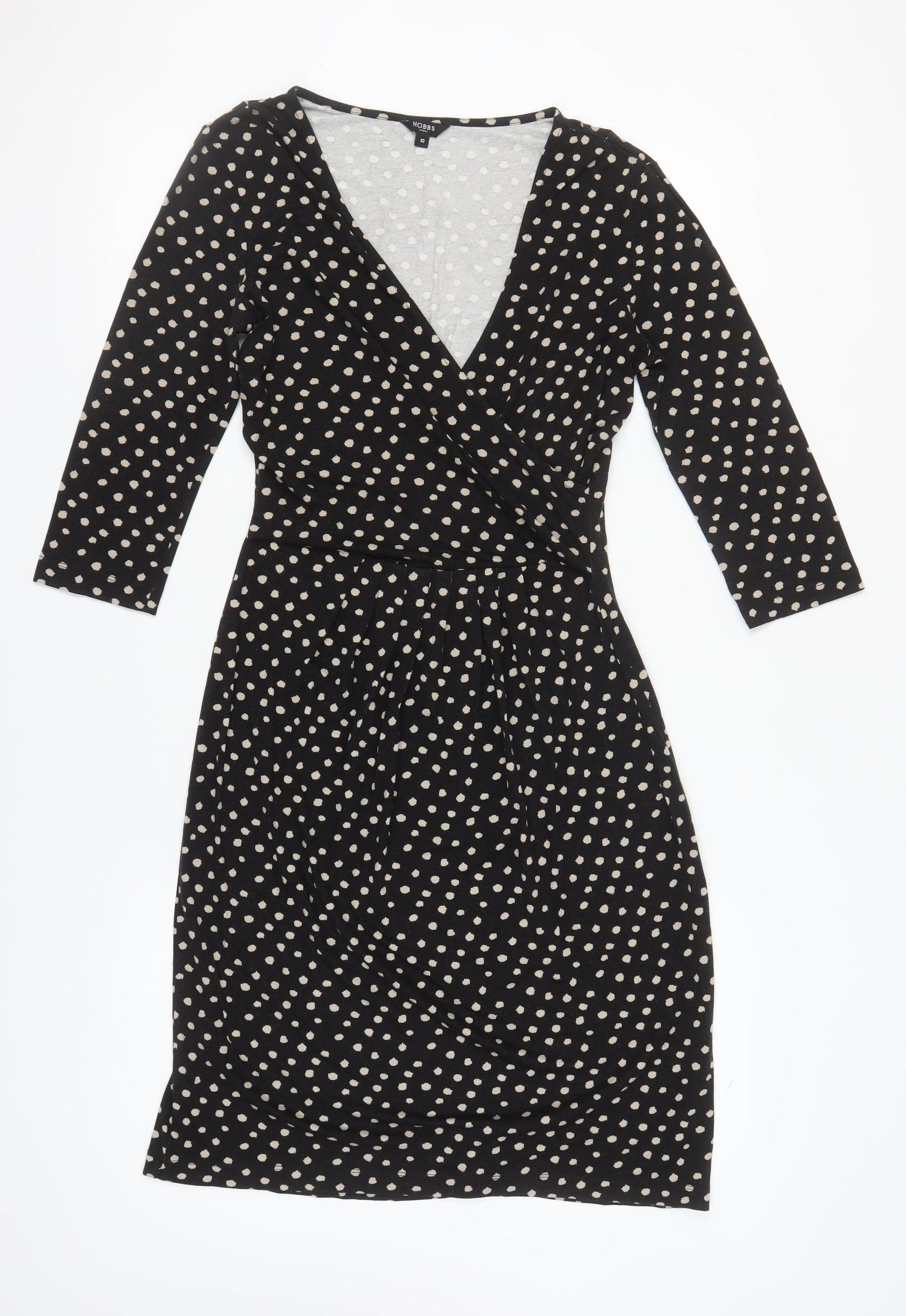 Step out in style with this elegant Hobbs wrap dress, perfect for casual and cocktail occasions. Designed for women, this black dress is adorned with chic polka dots, adding a playful element to its sophisticated wrap style. The size 10 fit is tailored to flatter, with a V-neckline and 3/4 sleeves providing added dimensions of style and comfort. The blend of viscose and elastane ensures a comfortable stretch, making it easy to wear all day or night. Despite slight wear, it maintains an excellent condition, offering a timeless addition to your wardrobe. Whether you're headed to a casual gathering or a party, this dress promises to make an impression with its blend of classic and contemporary fashion cues. Add a touch of sophistication and fun to your wardrobe with this versatile piece, ideal for those who appreciate a mix of elegance and functionality in their attire.