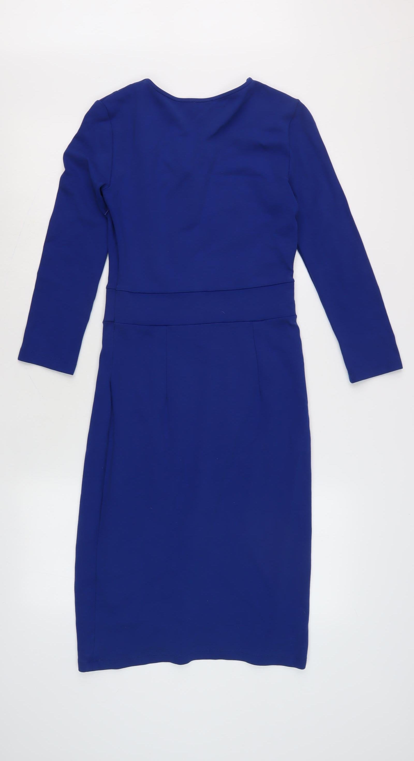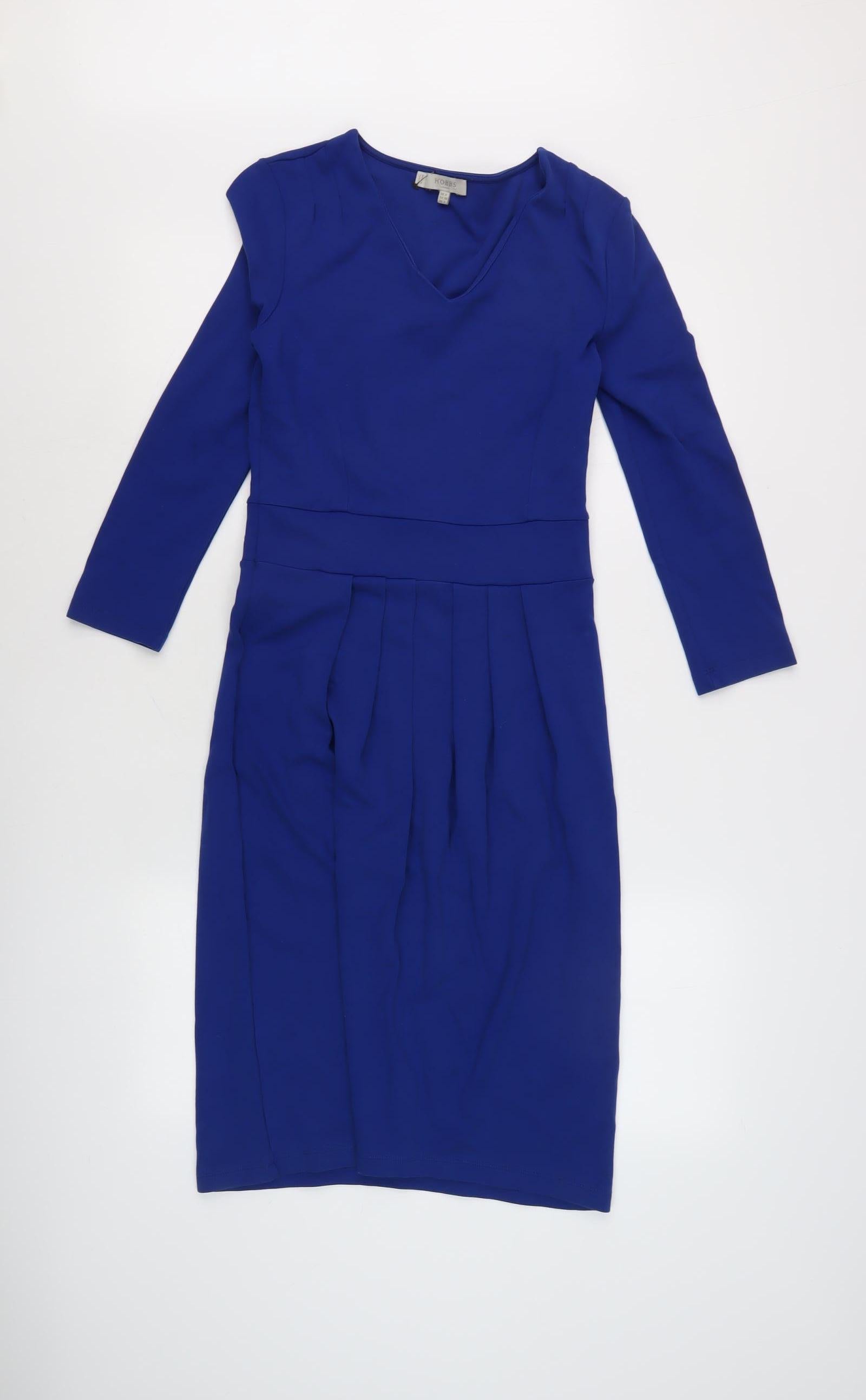 Elevate your wardrobe with this stunning blue pencil dress by Hobbs, perfect for both business and casual occasions. With a knee-length cut and a flattering V-neckline, it offers a sleek silhouette suitable for autumn and spring. The dress features long sleeves, making it ideal for cooler weather while maintaining a stylish edge. Made from a comfortable knit fabric blend of 96% polyester and 4% elastane, this dress ensures both comfort and a perfect fit. Its pullover design allows for easy wear. Ideal for women seeking a chic and elegant look, this Hobbs dress is a versatile addition to any collection.