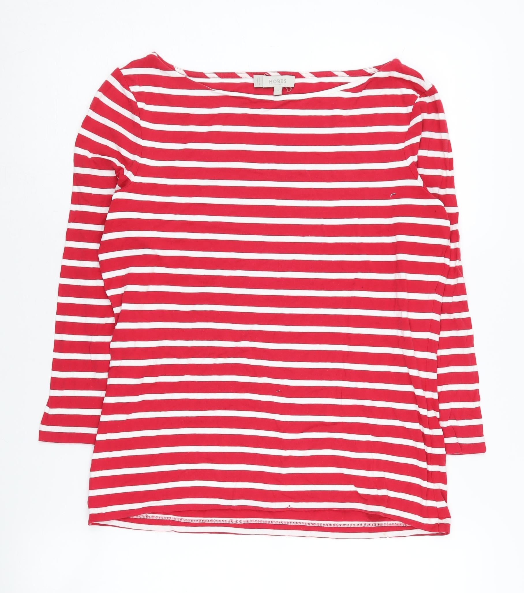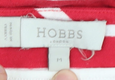 Discover style and comfort with this Hobbs Women's Red Striped Top, perfect for casual outings. Made from a soft blend of viscose and elastane, it offers a relaxed fit that ensures all-day comfort. The striking red and white striped pattern adds a touch of classic charm, making it a versatile addition to any wardrobe. Designed with a chic boat neckline, this top features 3/4 length sleeves that are ideal for transitioning through seasons. The medium size makes it a great fit for regular builds, ensuring it complements your silhouette beautifully. Despite being in good condition, a small hole on the sleeve adds a unique character to its casual appeal. Easy to care for, its machine washable material ensures low-maintenance styling. Highlight your look with this top that pairs effortlessly with jeans or skirts for a relaxed, yet stylish outfit, perfect for everyday wear.