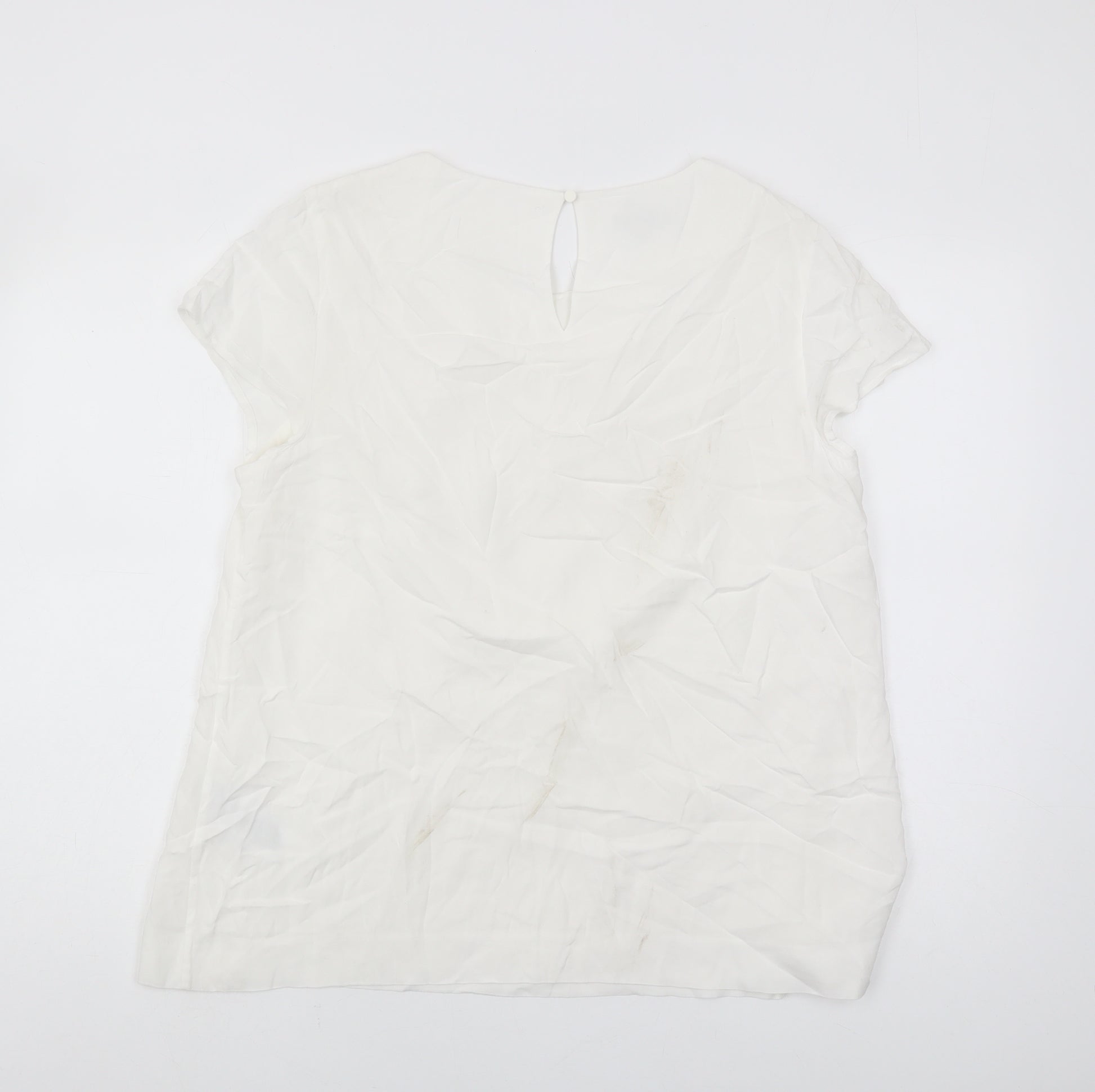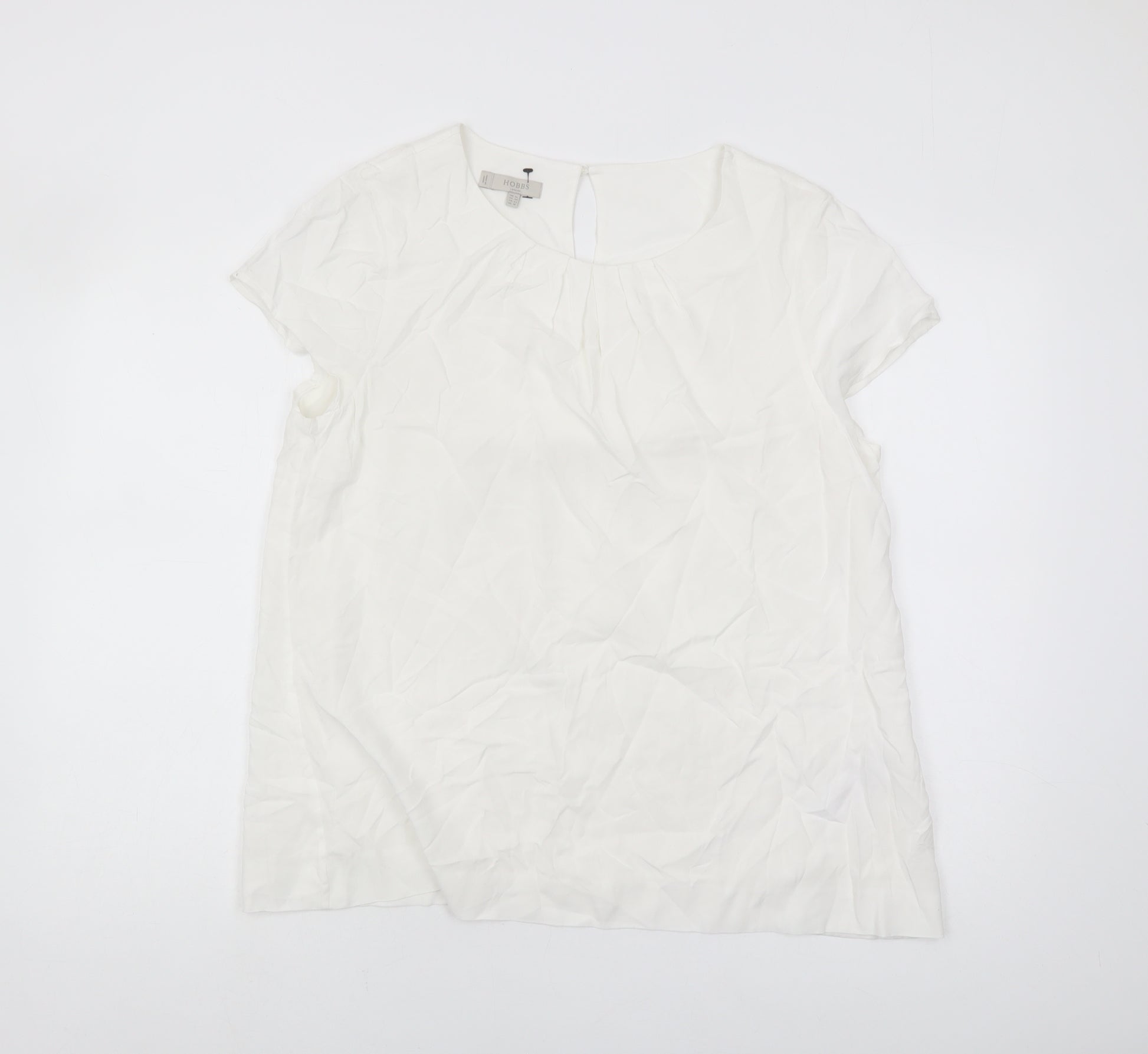 This elegant women's blouse from Hobbs is a versatile addition to any wardrobe. Tailored in a UK size 14, this white blouse offers a flattering fit with its short sleeves and comfortable regular size type. Crafted from 100% viscose, it delivers a soft, luxurious feel against your skin, making it perfect for all-day wear. The blouse features a classic round neck, ensuring timeless appeal that complements various styles. Its solid pattern and clean white colour make it an ideal choice for both casual and business occasions. Please note that the blouse exhibits some creasing and slight stains, thus priced accordingly. Despite these minor imperfections, this blouse remains a chic and practical choice for fashion-conscious women seeking style without compromising comfort.