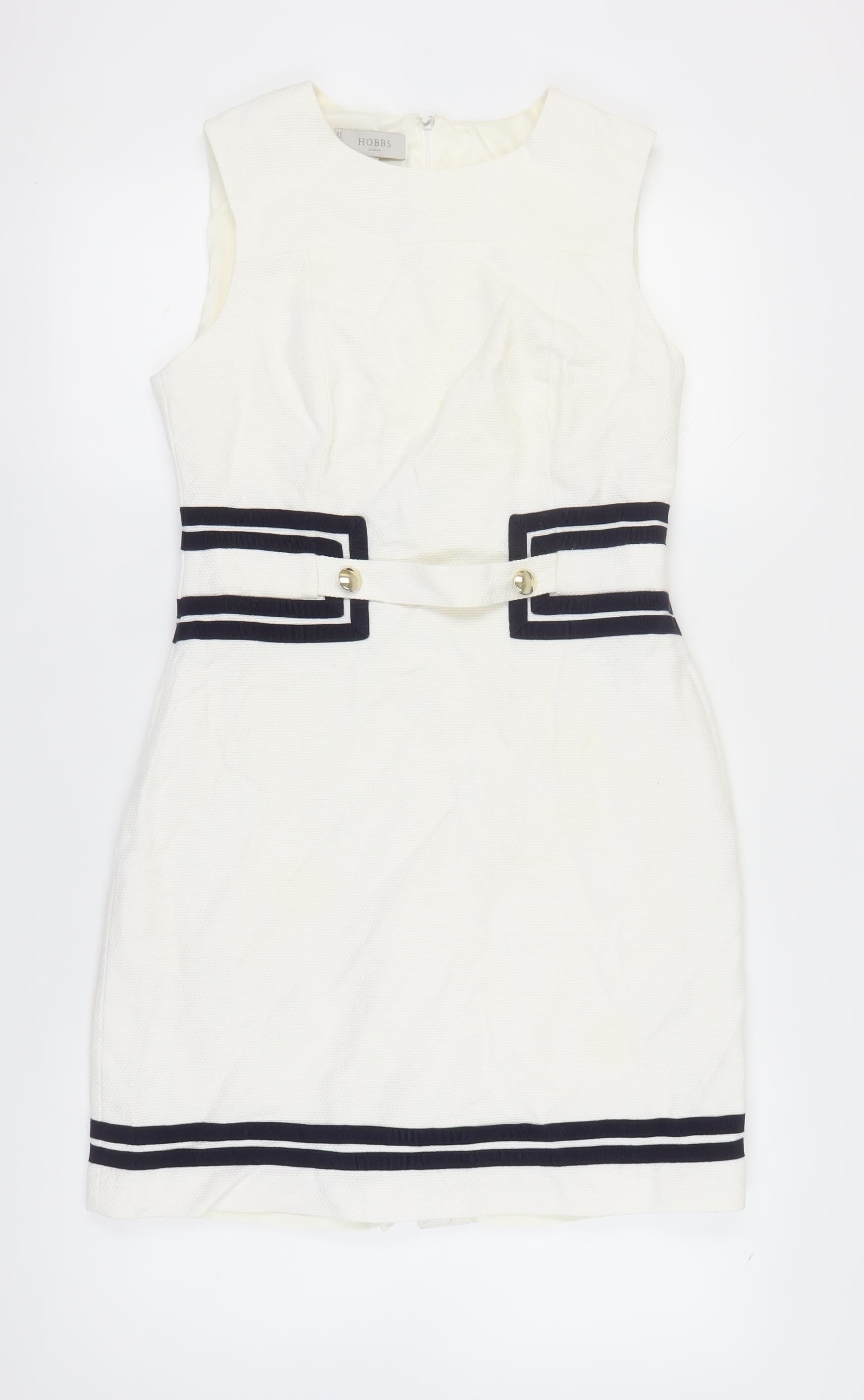 Elevate your wardrobe with this elegant Hobbs sheath dress, perfect for formal occasions this spring and summer. Tailored in the finest woven fabric, this knee-length dress eloquently showcases a sophisticated round neckline and accentuating belt design with button accents, offering a chic silhouette. The pristine white hue and clean lines ensure an effortlessly classy appearance, while the cotton-elastane blend assures comfort and durability. Ideal for weddings or upscale gatherings, this sleeveless dress embodies understated elegance. Though preloved, its excellent condition with slight signs of wear promises continued style.