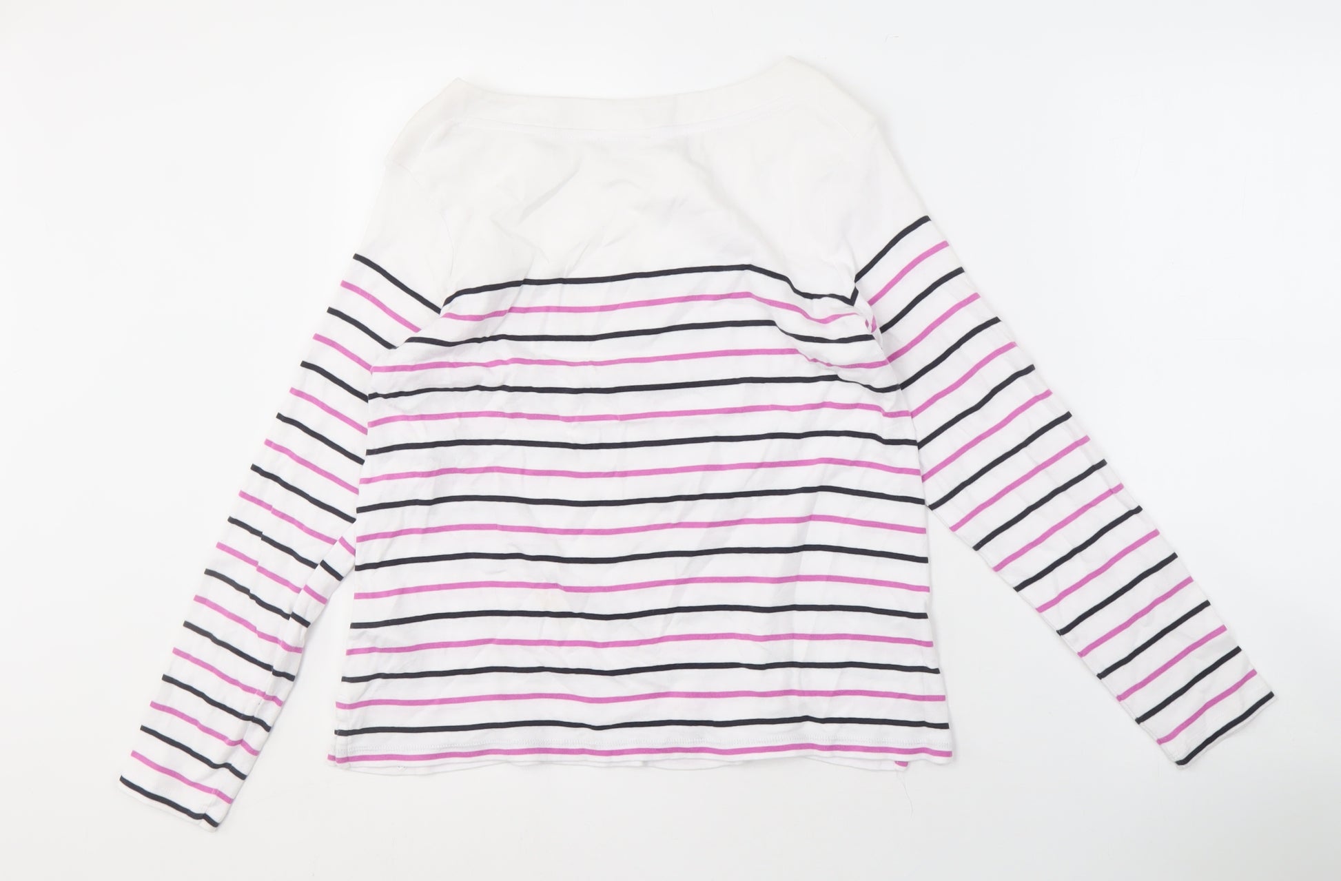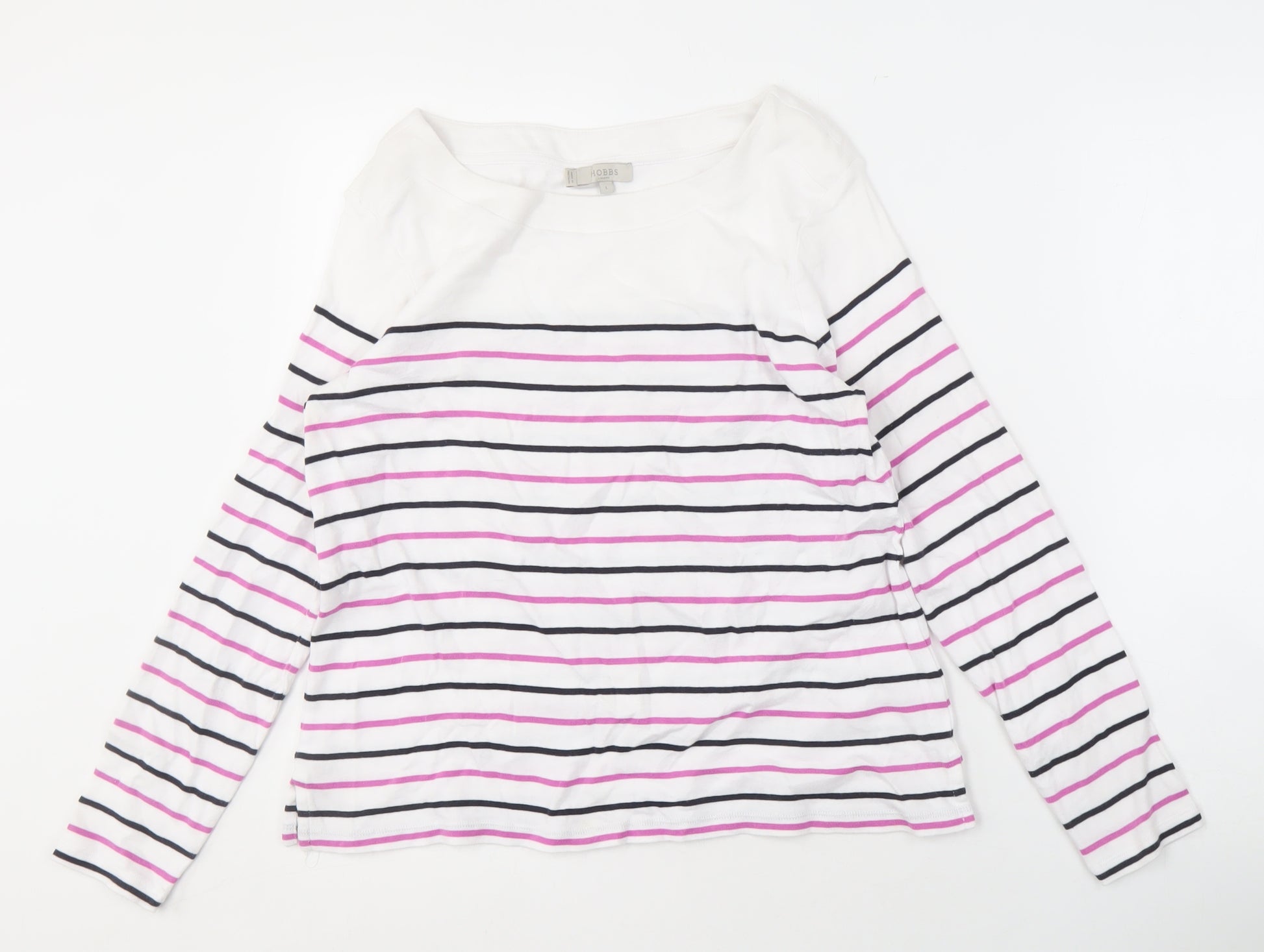 Discover timeless style with this Hobbs Women's White Striped Cotton T-Shirt. Perfectly crafted from 100% cotton, this T-shirt promises unmatched comfort and breathability. The immaculate boat neck design enhances its elegance, making it a versatile choice for casual outings or a relaxed day at home. With long sleeves and a classic striped pattern incorporating subtle pops of colour, it's an all-season must-have for any fashion enthusiast. Easy to care for, simply toss it in the machine, adhering to the care label guidelines for a crisp look every time. Despite its excellent condition, a slight wrinkled appearance offers a touch of laid-back charm. Whether pairing with jeans for a day out or lounging in style, this T-shirt ensures you'll always step out in confidence, combining simplicity with chic effortlessly.