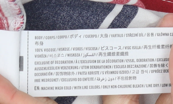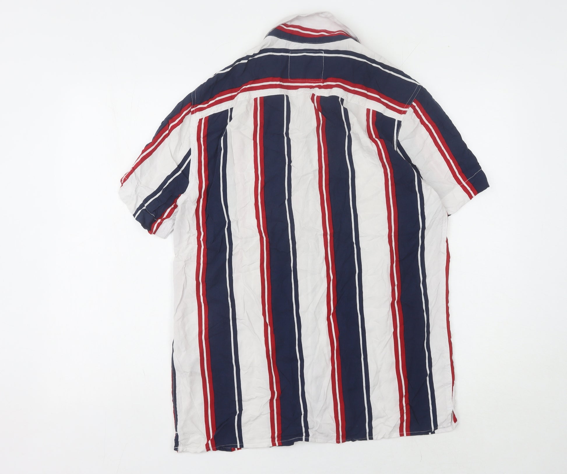 Step into casual comfort and style with this Hollister Men’s Striped Shirt. Ideal for brightening up your spring and summer wardrobe, this medium-sized shirt features a vibrant multicoloured pattern that's perfect for laid-back occasions. Crafted from 100% viscose, this shirt offers a lightweight and breathable feel, making it ideal for warmer weather. The short sleeves and classic collared neckline ensure it fits comfortably, whether you're heading to the beach, a casual get-together, or simply enjoying a sunny day out. The button-up front adds a traditional touch, while the striped pattern sets you apart with a splash of colour and modern charm. Easy to care for, this shirt is machine washable, allowing you to keep it looking fresh with minimal effort. While the condition is excellent, some wrinkling is present, but it can easily be ironed out for pristine presentation. With no original tags visible, this piece represents a fantastic value option for those seeking quality without the brand new price tag. Whether you're pairing it with jeans for a relaxed outing or shorts for a more casual look, this versatile piece fits seamlessly into your collection. Embrace the joy of casual fashion with Hollister's commitment to style and comfort.