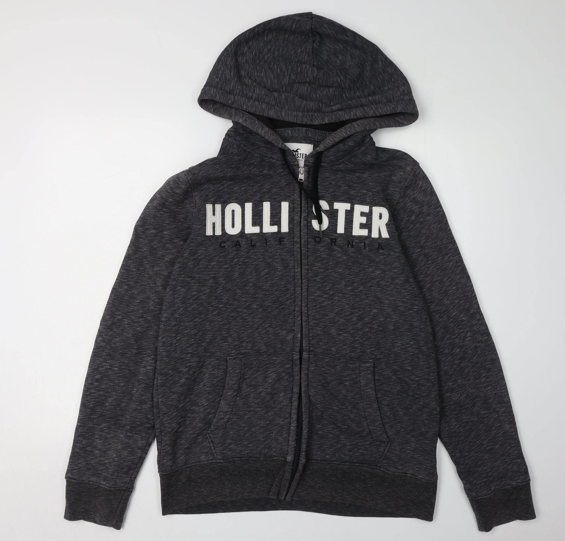 Embrace casual comfort and style with this Hollister Men's Grey Full Zip Hoodie. Made with a blend of 55% cotton and 45% polyester, this hoodie offers the perfect mix of softness and durability. Ideal for autumn and winter, it's designed to keep you warm and comfortable in chillier weather. The hoodie features a classic full zip closure complemented by a sleek hooded neckline and convenient front pockets for functionality and flair. The grey color gives it a versatile look that pairs well with almost anything in your wardrobe, while the prominent Hollister logo adds a trendy, youthful accent. Designed for a regular fit, this hoodie suits the modern man who values both style and ease. It's machine washable, making it a practical addition to any wardrobe. Whether you're heading out for a casual day or lounging at home, this hoodie is an excellent pick. Just note slight wear, but with its top condition and no original sales tags, it's perfect for those looking for quality and style at an attractive price.