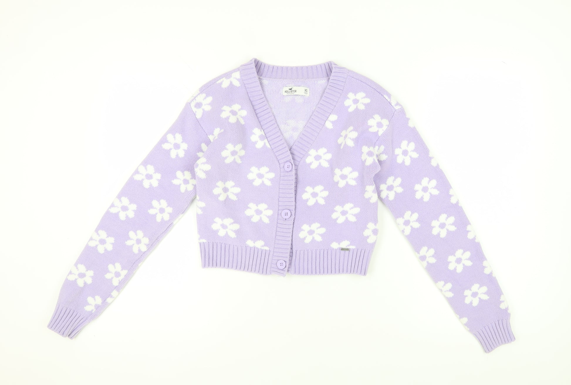 Enhance your wardrobe with this delightful Hollister Women’s Cardigan, rendered in a captivating shade of purple complemented by charming white floral patterns. Crafted from a soft blend of cotton, acrylic, nylon, and elastane, this cardigan is designed to offer optimal comfort while maintaining a chic, contemporary look.The lightweight, tight-knit fabric ensures you stay snug and cozy, perfect for the transitional seasons of spring and autumn. With its V-neckline and classic button accents, this cardigan effortlessly combines style and practicality. The long sleeves add an extra layer of warmth, making it an excellent choice for casual outings or a relaxed day at home.Ideal for casual occasions, this cardigan can be paired effortlessly with a range of outfits, whether you're going for a laid-back look with jeans or a more polished ensemble with a skirt. Its machine washable nature provides convenience, ensuring that maintenance is a breeze.Though pre-loved, this cardigan is in excellent condition, preserved well enough to serve as a lovely addition to your collection, offering both fashion and function. Make it yours today and enjoy the perfect mix of softness, color, and floral delight.