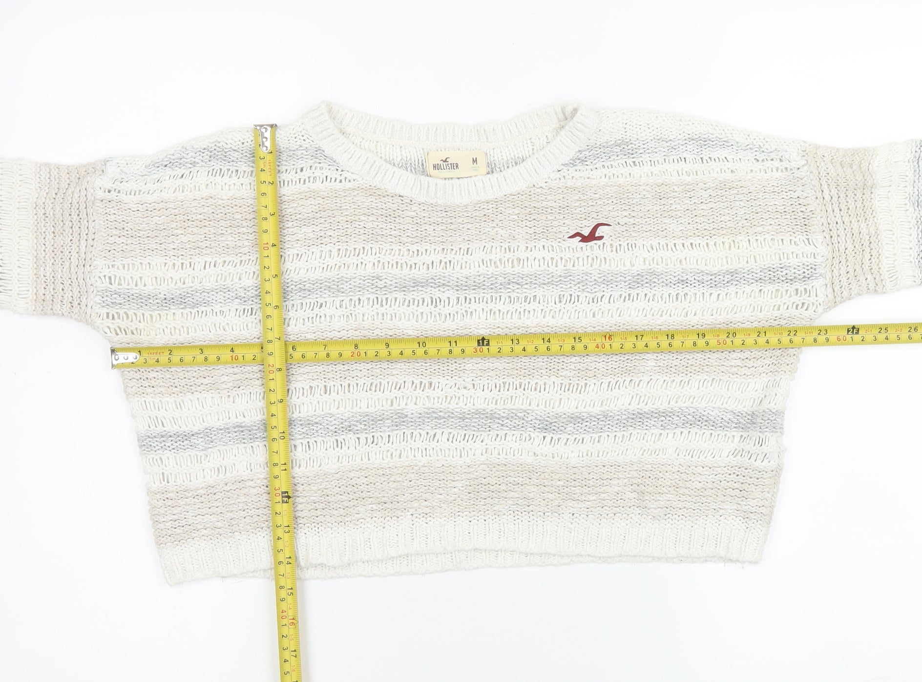 Elevate your casual wardrobe with this stylish Hollister Women's Beige Striped Knit Crop Jumper in size M. Crafted from a soft blend of 55% cotton and 45% acrylic, this open-knit pullover provides a lightweight and breathable feel, perfect for layering through spring and autumn. The classic crew neckline and long sleeves offer a timeless silhouette, while the cropped fit gives it a modern, youthful edge. The soft beige tones are complemented by subtle stripe detailing in neutral hues, creating a relaxed yet chic look that pairs beautifully with high-waisted jeans, skirts, or trousers. Featuring the signature Hollister logo embroidered on the chest, this jumper combines subtle branding with effortless California style. Ideal for casual outings, layering during cooler evenings, or relaxed weekend wear, this jumper delivers comfort and style in one. Gently worn and inspected for quality, this piece remains in excellent condition with no visible marks or damage, ensuring continued wearability and appeal. Machine washable for easy care, this Hollister striped crop jumper will become a versatile staple in your wardrobe, adding a touch of laid-back charm to any outfit. Whether styled with denim shorts for warm days or layered under a jacket on breezy nights, it’s a must-have for those who appreciate casual elegance and reliable comfort.