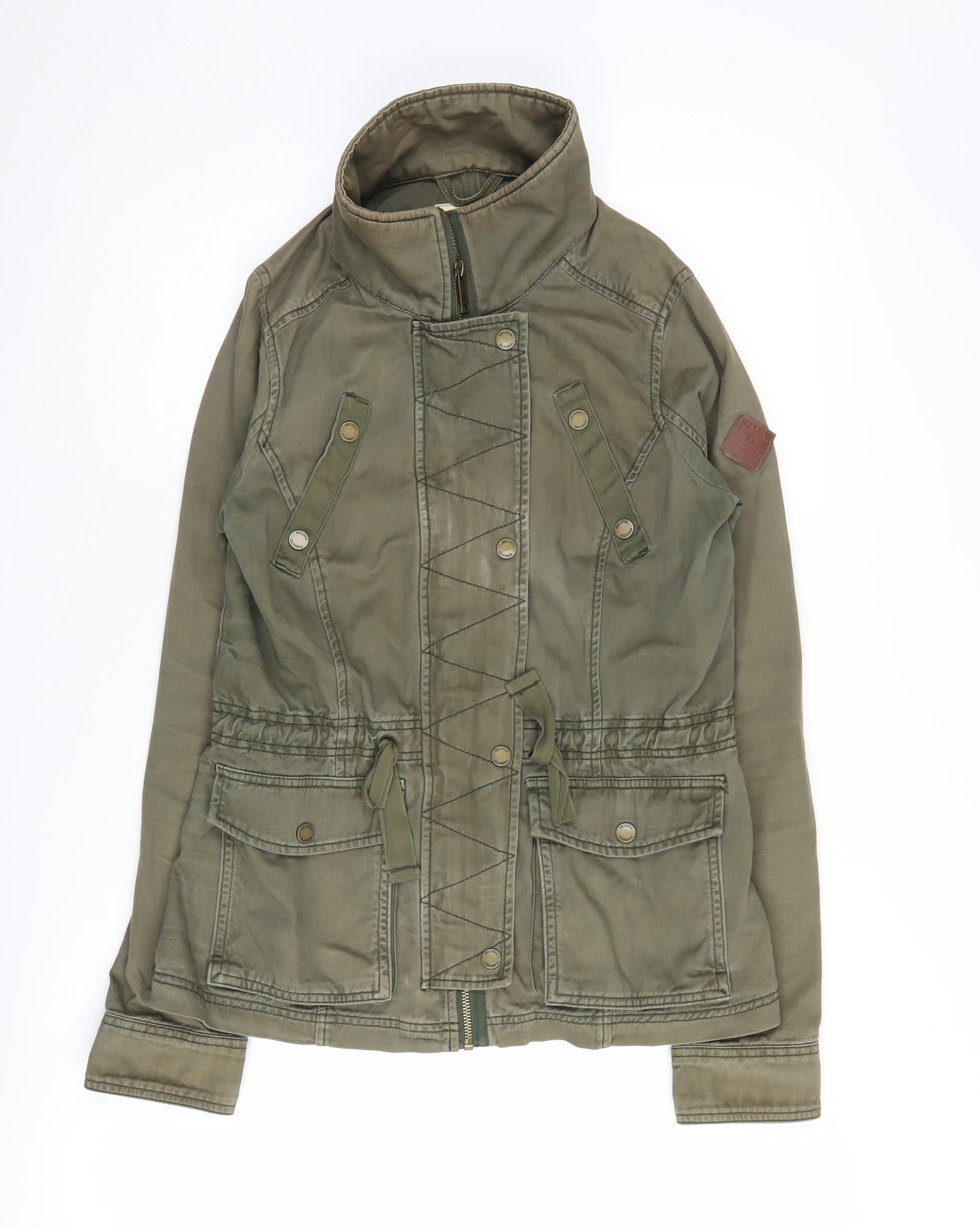 Step out in style with this chic green military jacket from Hollister. Designed for both functionality and fashion, this jacket is crafted from 100% breathable cotton, making it perfect for those crisp autumn and spring days. The jacket features a full zip closure and elastic waist for a comfortable fit, while the button accents add a dash of charm to its rugged appeal. Ideal for casual occasions, this short-length military jacket is accentuated with practical pockets for your essentials, ensuring you have everything within reach. Whether it's a casual day out or an evening stroll, its regular fit and long sleeves provide warmth and flexibility. With a theme that exudes a trendy army vibe, it's a wardrobe must-have for women looking to dress effortlessly and in vogue. The jacket's durable canvas fabric ensures longevity, making it a worthwhile addition to your collection. Available in size M, it's tailored for a regular fit, ensuring comfort and ease of movement. Though pre-owned, the jacket is in excellent condition with slight wear that adds character to its style. Embrace the cool, laid-back look with this Hollister military jacket – the ideal choice for any fashion-forward woman.