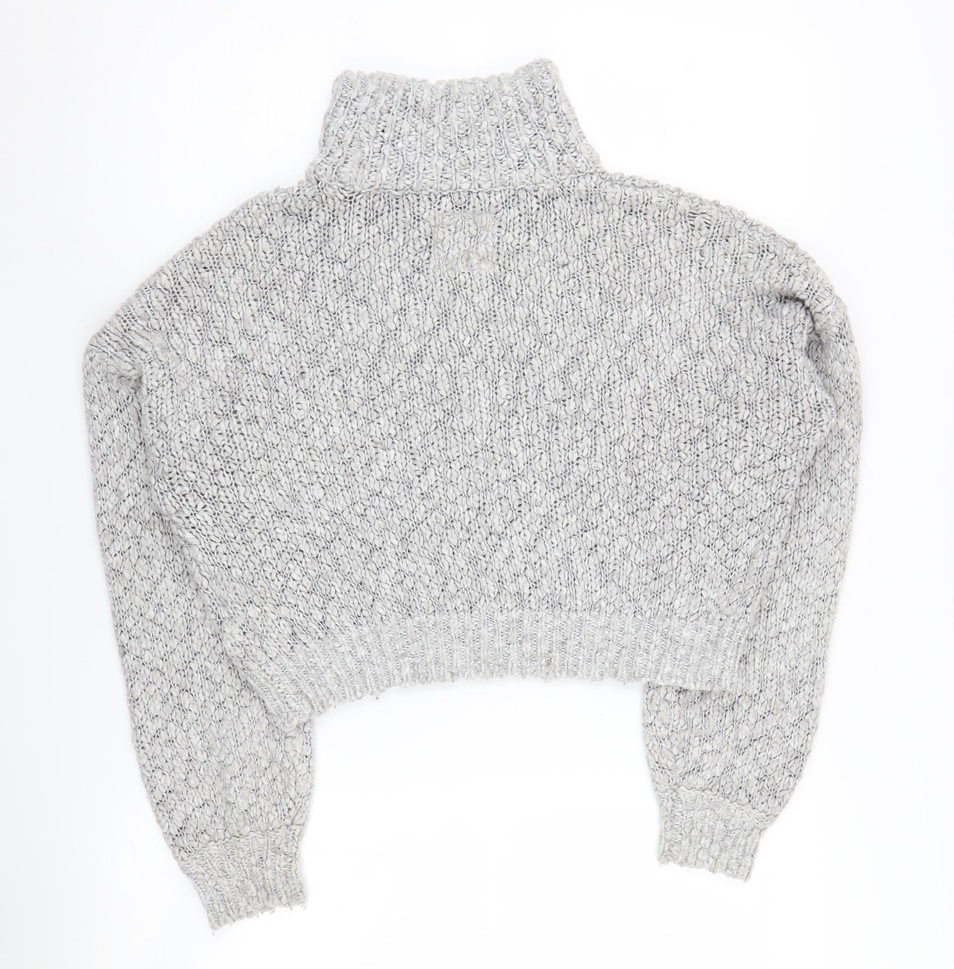 Experience comfort and style with this Hollister Women's Grey Chunky-Knit Roll Neck Jumper. Crafted with a blend of acrylic, nylon, polyester, and metallic fibres, this pullover offers a soft, cosy feel that's perfect for those cooler autumn and winter days. The grey knit design and roll neck add a touch of elegance, while the regular fit ensures a relaxed and comfortable wear, suitable for any casual occasion. This versatile piece is machine washable for easy care, making it a practical addition to your wardrobe. Ideal for pairing with jeans or a casual skirt, it will quickly become your go-to jumper for laid-back yet stylish outfits. Its excellent condition means you'll be adding a quality piece to your clothing collection without compromising on style or comfort. Shop now and elevate your knitwear game with this fashionable yet functional piece from Hollister.