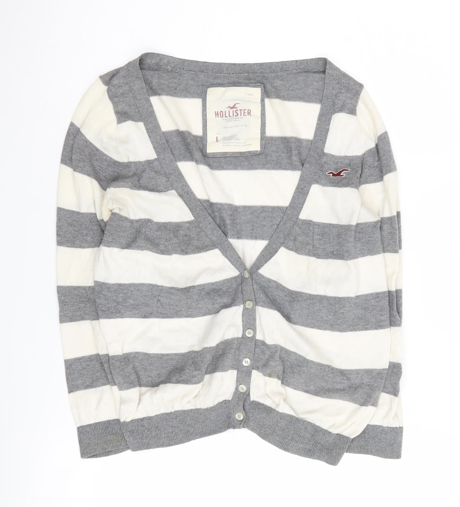 Step into casual comfort with this stylish Hollister Women's Striped Cardigan in a chic grey. Crafted from 100% cotton, this long sleeve cardigan offers a snug fit with its tight-knit style and features a classic V-neckline. The button accents add a touch of elegance, making it a versatile addition to your wardrobe. Ideal for spring, summer, and autumn, this cardigan is perfect for layering over your favourite tops for a relaxed yet polished look. Its regular fit and size make it comfortable for everyday wear, whether you're heading out for a casual outing or simply lounging at home. The grey and white striped pattern adds a modern twist to a timeless piece, ensuring you stand out in style. Although gently pre-loved, it remains in very good condition with only a minor stain on the hem, offering you quality at a great price. Hand wash only to maintain its form and comfort. Don't miss out on this wardrobe essential that combines Hollister's iconic style with practicality.