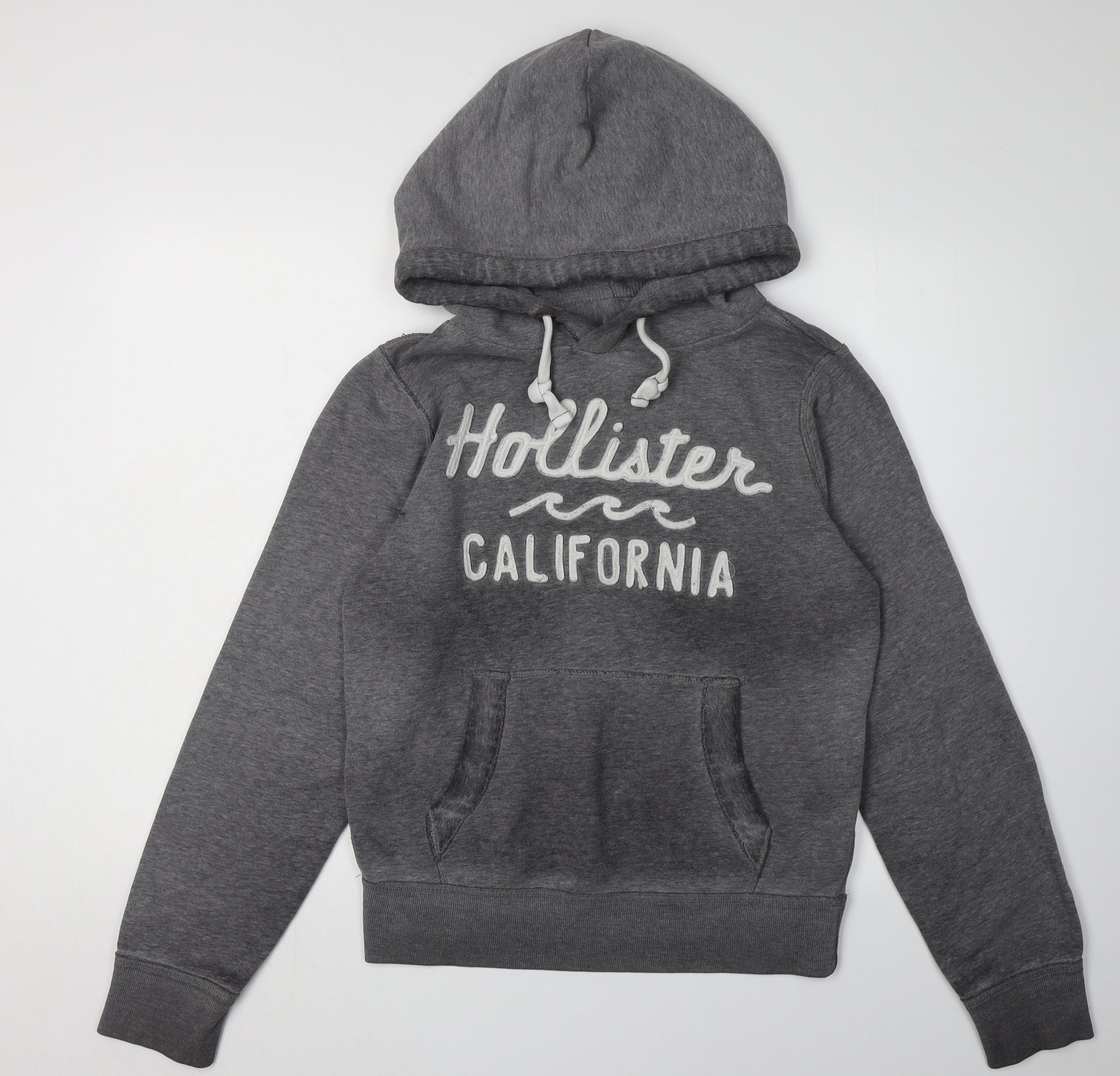 Embrace casual comfort with this Hollister Women's Grey Pullover Hoodie, perfect for adding a touch of California style to your wardrobe. Designed with a timeless logo on the front, this hoodie is a must-have for any fashion-conscious individual. The hoodie is crafted from a cosy fleece blend of 55% cotton and 45% polyester, ensuring both warmth and comfort during the colder months. Its hooded neckline and long sleeves offer additional protection against chilly weather, while the drawstring closure ensures a snug fit. Ideal for autumn and winter wear, this versatile piece features practical pockets for convenience and a relaxed, regular fit, making it suitable for daily outings and casual activities. Despite a small hole on the sleeve, the overall condition remains good, making this hoodie a great bargain for fashion seekers. Elevate your everyday style with this essential pullover hoodie, offering comfort and unique Californian flair. Pair it with jeans or joggers for a laid-back look that's perfect for weekend adventures.