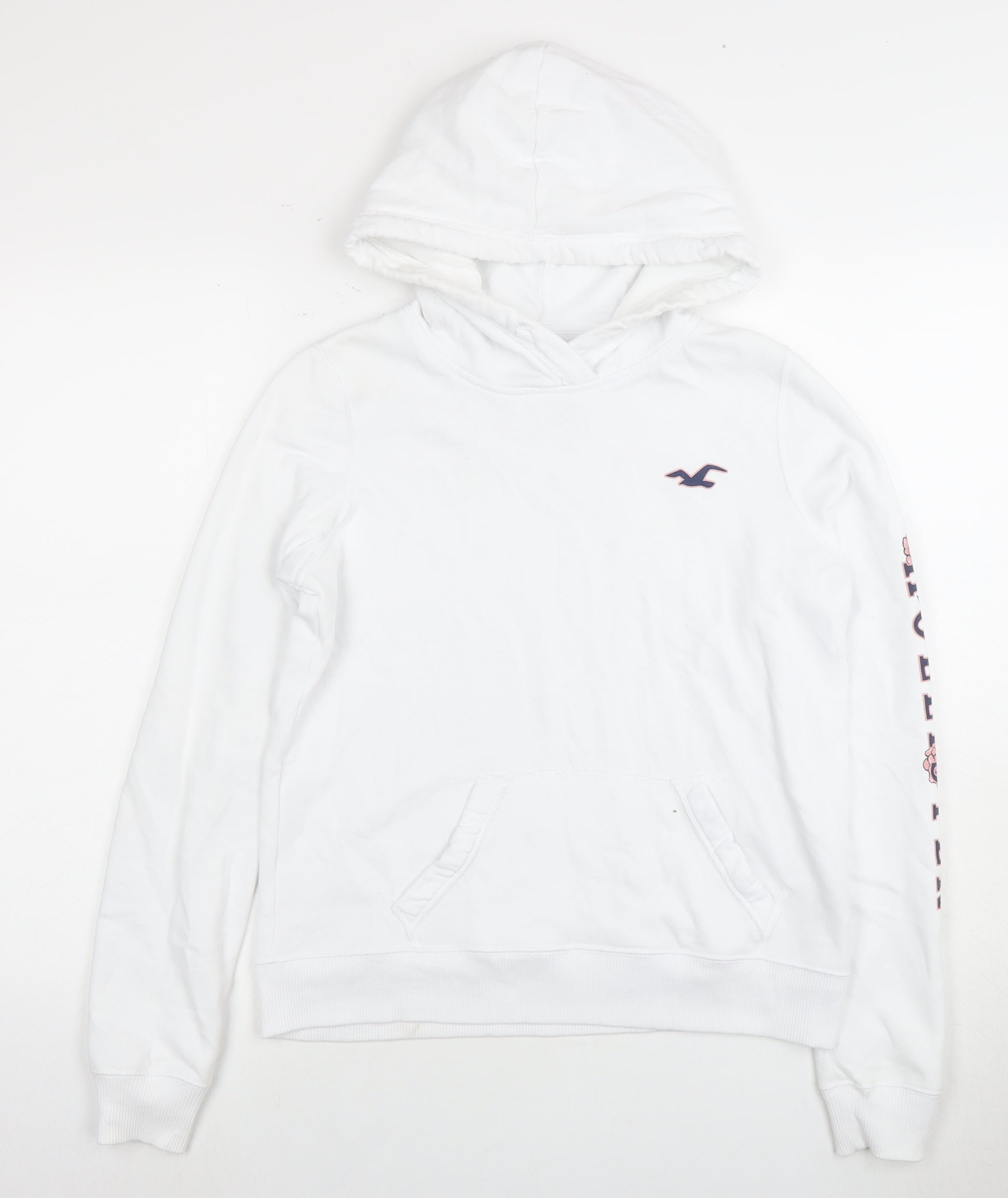 Embrace effortless style with this Hollister Women's Pullover Hoodie in a versatile white shade, perfect for casual outings. Designed with a comfortable crew neck and long sleeves, this hoodie ensures warmth while maintaining a lightweight feel. Crafted from a high-quality blend of cotton and polyester, it offers both comfort and durability, making it a staple in any wardrobe. Featuring practical pockets and a classic embroidered logo accent, it's an ideal choice for everyday wear. Easy to care for, this piece is machine washable and crafted for regular fit, ensuring it suits a variety of body types. Despite slight wear on the cuffs, it remains in excellent condition, ready to enhance your collection with its understated yet stylish design. Perfect for those laid-back days, this hoodie is a must-have for anyone looking to add a versatile, timeless piece to their ensemble.