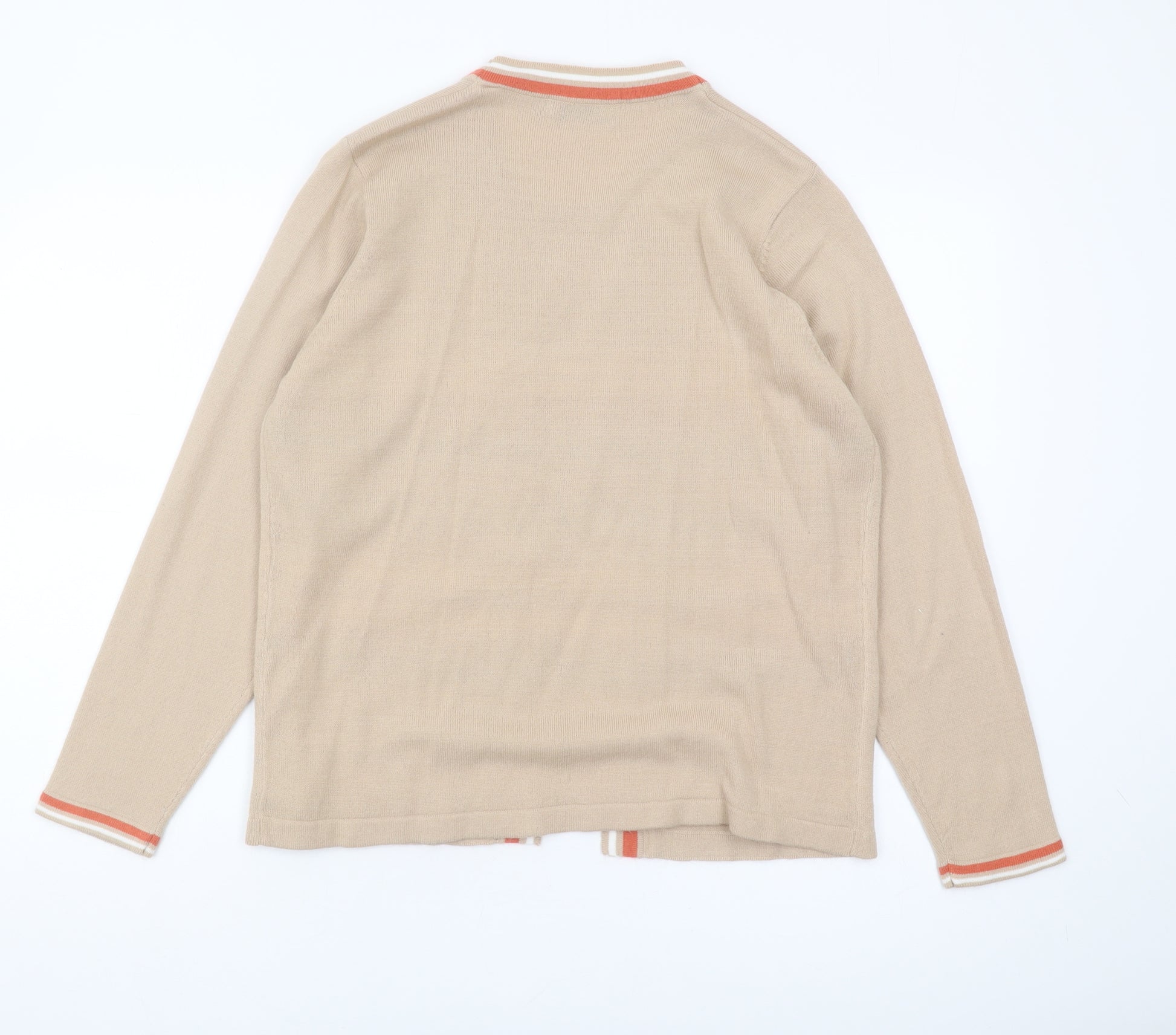 Embrace classic style with this exquisite Honor Millburn cardigan. Designed for women, this medium-sized beige cardigan is a versatile addition to any wardrobe. Made from 100% acrylic, it offers a soft and comfortable knit, perfect for layering during casual outings. Its long sleeves and regular fit ensure it drapes beautifully, providing both warmth and style. The cardigan's striped pattern adds a subtle touch of modernity, making it ideal for a variety of occasions, from casual coffee dates to relaxed office settings. Its machine-washable nature allows for easy maintenance, ensuring you can enjoy its timeless beauty without worry about wear and tear. Although pre-owned, it remains in excellent condition with no visible wear or damage, ready for its next adventure in your wardrobe. Whether paired with jeans for a laid-back look or layered over a blouse for a more polished ensemble, this Honor Millburn cardigan is bound to become a favourite. Don't miss this chance to own a piece that blends comfort with classic elegance, offered at a fantastic price.