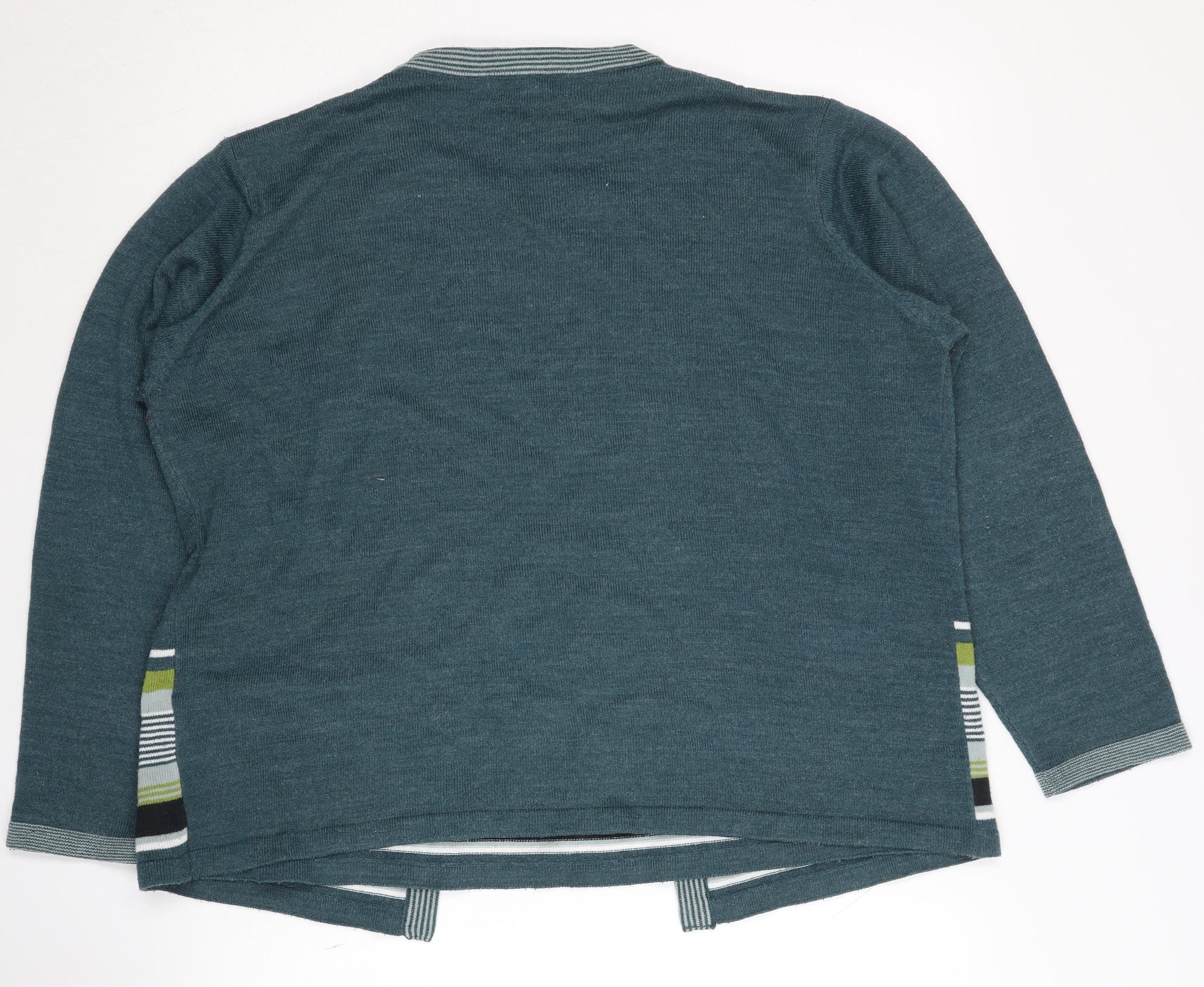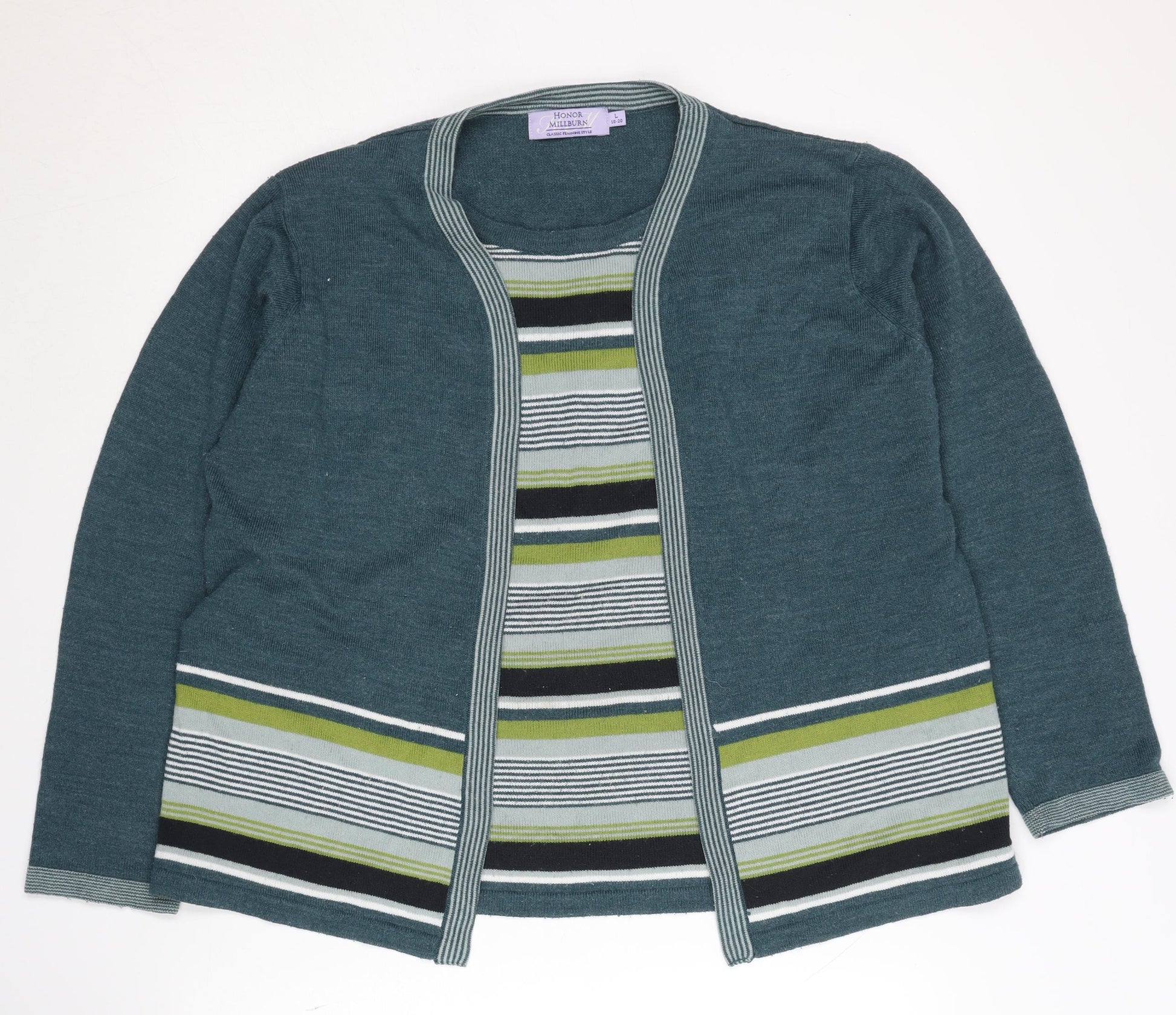 Elevate your wardrobe with this elegant Honor Millburn cardigan, perfect for any occasion. Crafted from a soft acrylic material, this green cardigan promises both comfort and style. The striped pattern adds a touch of classic charm, making it a versatile addition suitable for casual outings or workwear. Designed for women, the cardigan features long sleeves and fits a regular size L. Its simple open style makes it easy to layer over any outfit, providing effortless elegance. With its excellent condition, this piece is sure to become a staple in your fashion repertoire.
