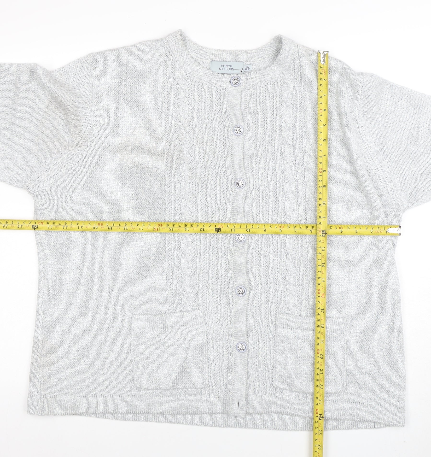This stylish Honor Millburn women's grey cardigan in size XL offers timeless comfort and classic appeal. Expertly crafted from 100% acrylic, it provides a soft and lightweight knit that’s perfect for layering through the autumn and winter months. The cardigan features a beautiful cable-knit design across the front, complemented by a crew neckline that adds a touch of elegance to everyday wear. Designed with practicality in mind, it includes front pockets and button fastening for a polished, versatile look. The long sleeves and comfortable regular fit make it easy to wear over blouses or t-shirts, ensuring warmth without bulk. The soft grey shade is effortlessly chic, pairing well with jeans, skirts or trousers for both casual and workwear occasions. Whether you’re heading out for a relaxed lunch or adding an extra cosy layer to your office outfit, this cardigan delivers style and practicality in one. The acrylic material ensures easy maintenance, as it’s machine washable and durable enough for regular use. This piece is in very good condition with only a small discoloured mark on the front, barely noticeable when worn. Ideal for cooler days, it’s a wardrobe staple for anyone seeking comfort with classic design. Add a touch of refined simplicity to your collection with this Honor Millburn cardigan, an essential item that blends warmth, softness and timeless fashion into a single piece.