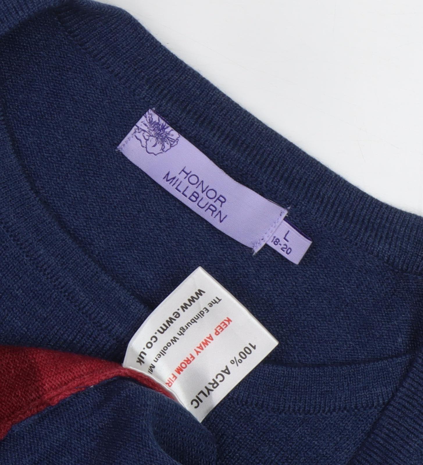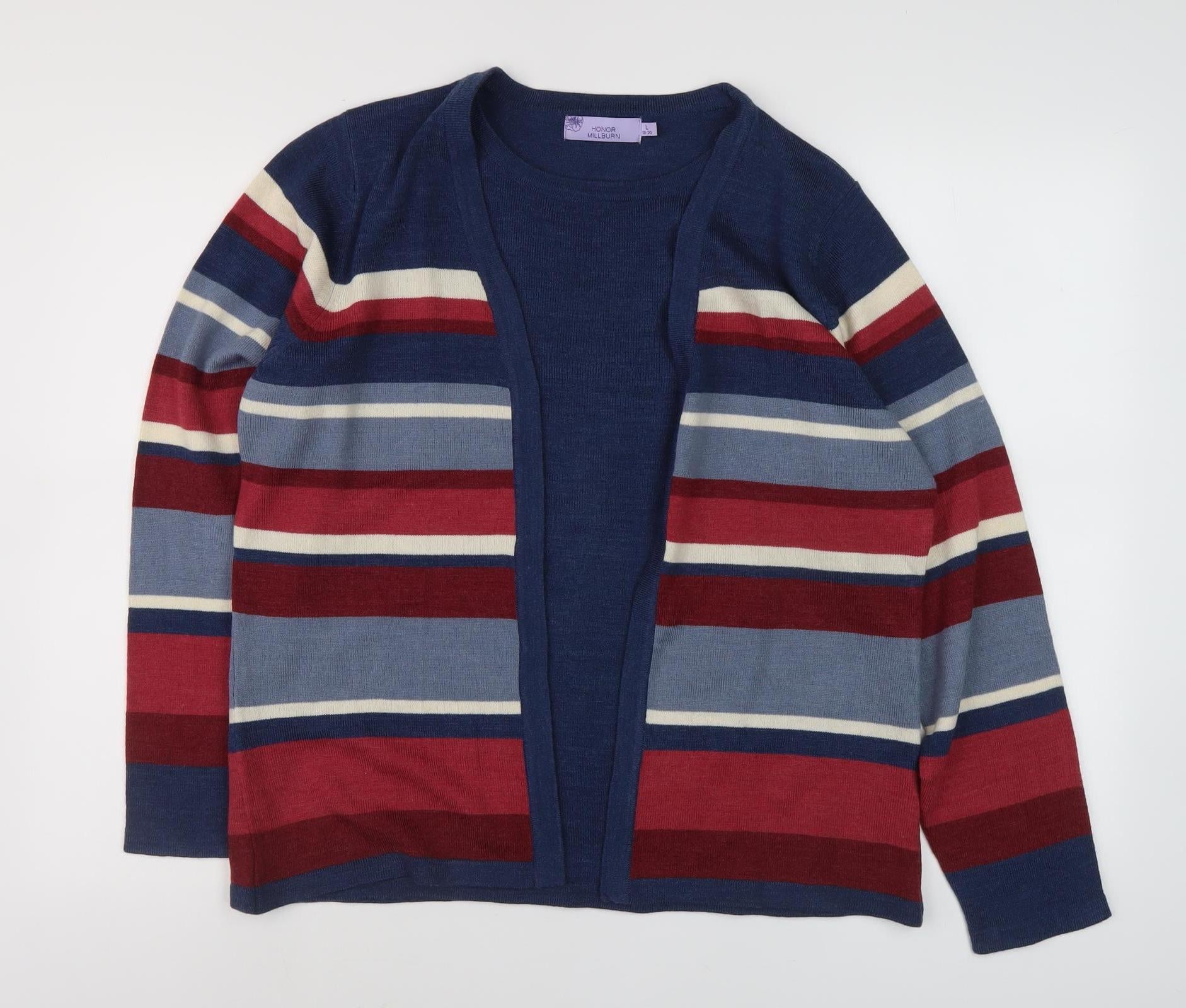 This elegant Honor Millburn women's cardigan is a versatile addition to any wardrobe. Beautifully crafted in a multicoloured stripe pattern, this knit cardigan is a perfect choice for the autumn and winter seasons. Made from 100% acrylic, it offers a comfortable and warm feel, ideal for layering over tops or dresses. The long sleeves and regular fit provide a classic and flattering silhouette that complements regular and casual styles. With its crew neck design, this cardigan brings a timeless touch to both modern and traditional outfits. Suitable for casual occasions, this piece adds a stylish layer of warmth without compromising on style. Lightly worn and in excellent condition, it promises to be an enduring staple for your seasonal wardrobe. Perfect for anyone looking for a blend of comfort, warmth, and timeless style, it embodies a chic and sophisticated look suited for everyday wear.