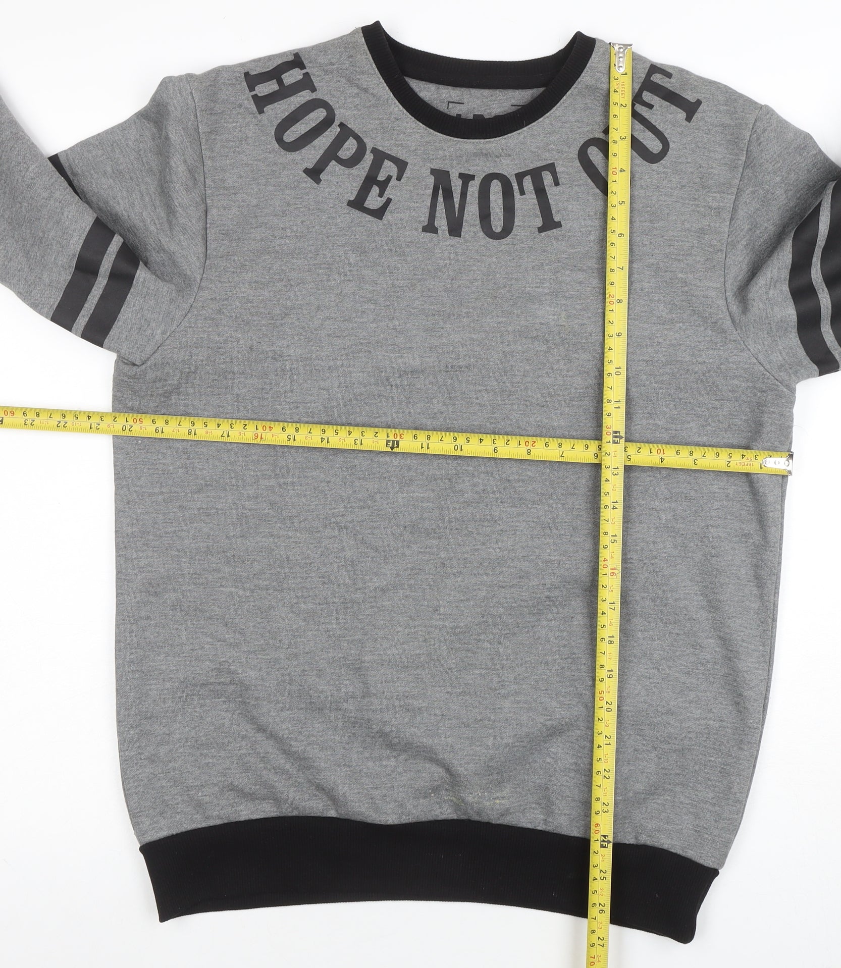 Add a touch of motivation to your casual wardrobe with this Hope Not Out men’s grey crew neck sweatshirt. Designed for comfort, this high-quality pullover features a bold ‘HOPE NOT OUT’ graphic across the front, highlighting the brand’s statement style. The sleek grey jersey fabric is complemented by contrasting black ribbed trims at the neckline, cuffs, and hem for a modern and sporty finish. Two subtle black stripes on each sleeve lend a stylish, athletic-inspired touch. Crafted from a soft cotton and polyester blend, this sweatshirt provides breathability and warmth, making it ideal for layering throughout autumn, winter, and spring. The medium weight jersey material ensures a comfortable fit that’s perfect for everyday wear, lounging, or light activity. Designed in a regular fit, it sits comfortably without being too loose or too tight. The crew neckline offers a classic casual look suitable for all occasions. This sweatshirt is easy to care for and fully machine washable, adding practical appeal to its stylish design. Best suited for men who enjoy a clean, sporty aesthetic with a hint of attitude, it pairs effortlessly with jeans, joggers, or shorts. Whether you’re relaxing at home, heading to the gym, or out for a casual day, this versatile piece delivers comfort and understated confidence. In excellent pre-owned condition with minimal signs of wear, this Hope Not Out sweatshirt offers great style and value. If you’re looking for a modern yet comfortable graphic pullover that combines quality with an encouraging message, this grey sweatshirt is a great choice for your everyday wardrobe.