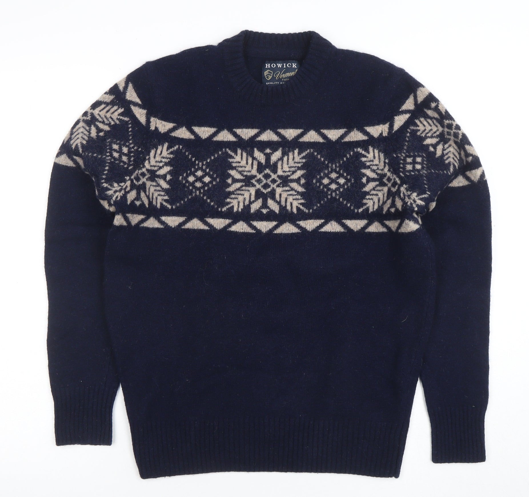 Wrap up in timeless winter style with this classic Howick Vermont Fair Isle jumper. Beautifully crafted from an 80% lambswool and 20% nylon blend, this jumper delivers exceptional warmth with a soft, comfortable feel against the skin. The navy blue base is complemented by a beige Fair Isle pattern across the chest and shoulders, offering a seasonal design that adds character to any cold-weather outfit. Designed for men, this crew neck pullover features long sleeves and ribbed trims at the neckline, cuffs, and hem for a snug and flattering fit that maintains its shape wear after wear.The mid-weight knit makes it versatile for both layering and standalone wear, ideal for pairing with jeans or chinos for a relaxed but polished look. Whether you're heading out for a winter stroll or enjoying a cosy evening indoors, this jumper keeps you warm while maintaining a classic, refined aesthetic. The stylish geometric snowflake motif gives a nod to traditional Nordic patterns, making it perfect for autumn and winter wardrobes.Durable yet soft thanks to its quality knit construction, this jumper reflects Howick’s craftsmanship and heritage-inspired design. It’s machine washable for easy care and ideal for all-season wear when temperatures drop. With its breathable yet insulating lambswool blend, it provides lasting comfort that never compromises on style. Finished in a deep navy hue, it remains sophisticated and easy to coordinate while embodying effortless masculine charm. Perfect for casual weekends, workwear layering, or festive occasions, this Fair Isle pullover will become a wardrobe favourite that you reach for year after year.