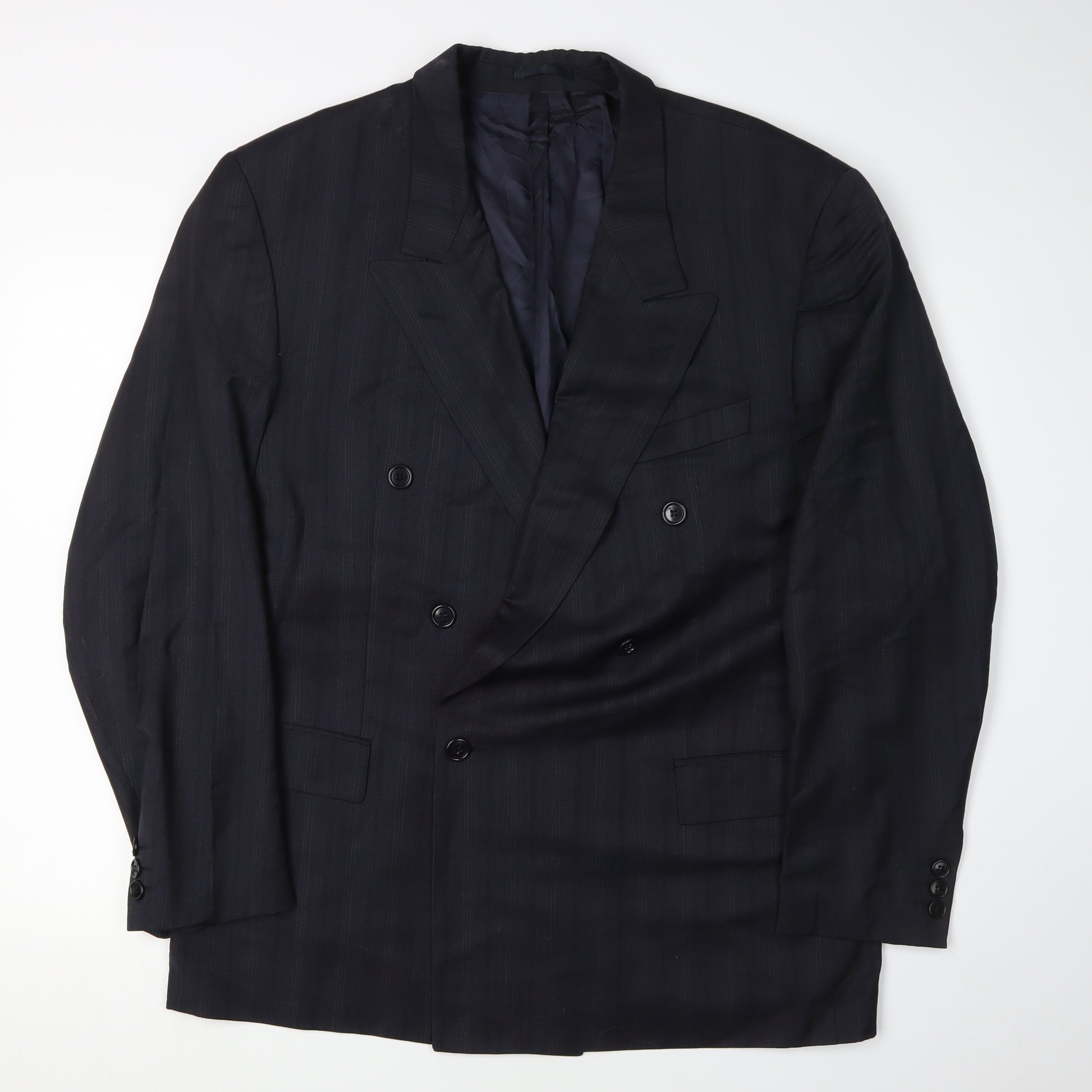 Elevate your wardrobe with this classic Hugo Boss men's blazer in a sophisticated black hue, perfect for formal and business occasions. Crafted with premium wool, this double-breasted jacket ensures both style and warmth, making it an ideal choice for autumn and winter. The blazer's regular fit and peak lapel add to its timeless appeal, while the subtle stripe pattern enhances its elegant design. Featuring a four-button front and double-vented back, this jacket offers a perfect blend of modernity and tradition. The inner pockets provide functionality without compromising on style. Its tweed fabric and viscose lining ensure comfort and durability, making it a versatile piece for any gentleman's collection. Whether you're attending a formal event or a business meeting, this jacket is set to make a lasting impression. Although in excellent condition, please note there are no original sales tags. This piece is offered at a fantastic value for pre-owned designer apparel.