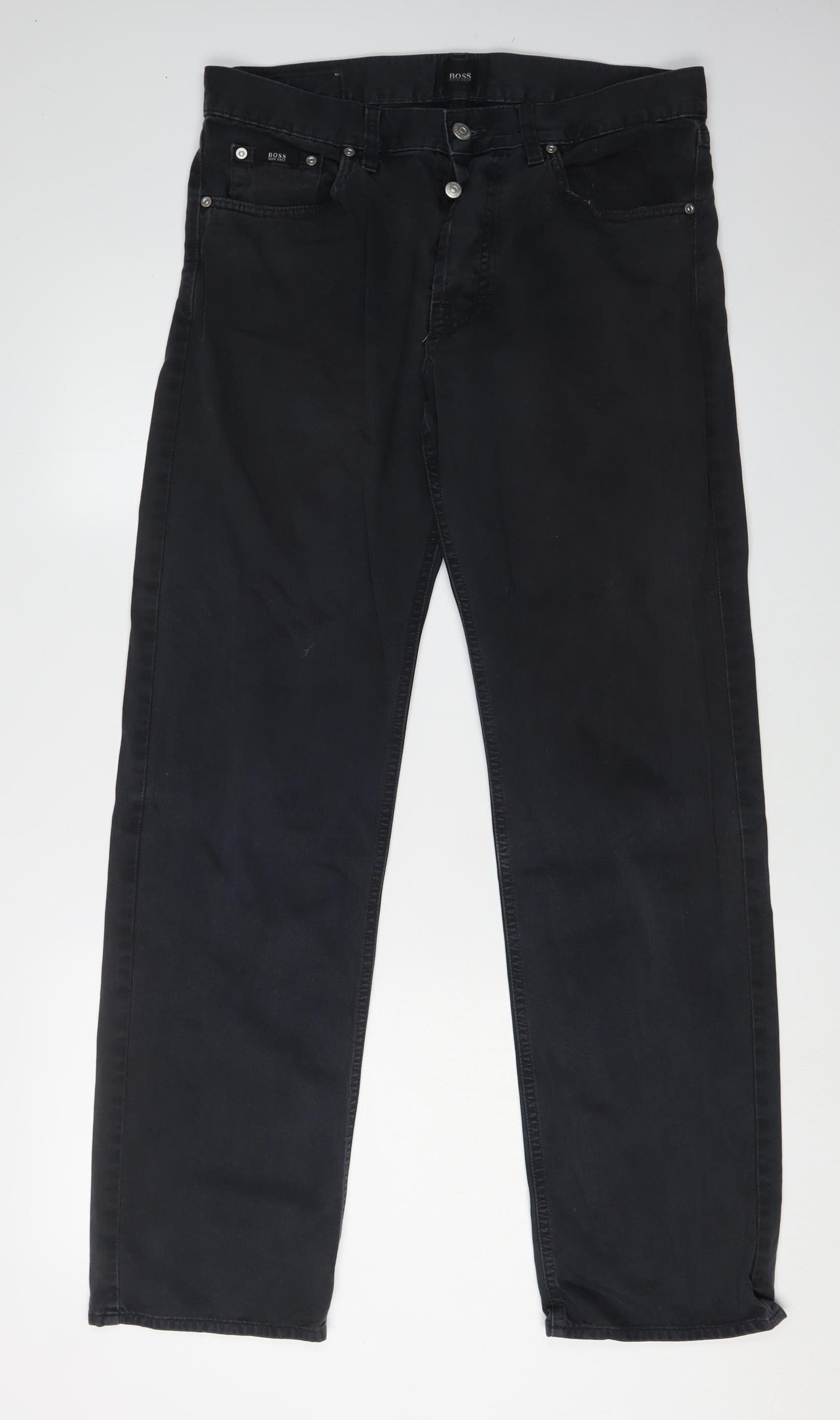 Step into timeless style and unmatched comfort with these Hugo Boss Men's Black Straight Jeans, perfect for any fashion-forward gentleman. Crafted from high-quality 100% cotton, these jeans offer not only unparalleled softness but robust durability, ensuring you'll enjoy them for seasons to come. The classic black shade lends itself to versatile pairing, whether you choose a casual tee or a formal shirt, these jeans transition effortlessly from laid-back weekends to smart casual office settings.Featuring a regular size type with a 34-inch waist and a comfortable 32-inch inseam, they provide an exceptional fit for most body types. The mid-rise design adds to the jeans' comfort, ensuring they sit perfectly on the waist. The straight style offers a clean silhouette that's both modern and classic, making them a staple piece in any wardrobe. With a traditional 5-pocket design, these jeans are not only stylish but highly functional, offering ample space for essentials like your wallet or smartphone.The jeans come with button closure, adding a touch of sophisticated detail, while the subtle logo and button accents reinforce the luxury brand's signature prestige. With machine washable fabric, maintenance is a breeze, allowing you to keep them looking fresh with minimal effort. Despite their gently used status, indicated by the minor spot on the fabric, these jeans maintain their overall excellent condition, perfectly ready to be worn right away. Don't miss the opportunity to enhance your collection with these stylish and versatile Hugo Boss jeans.