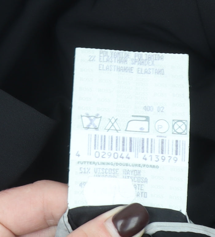 Elevate your formal wardrobe with this timeless black blazer from Hugo Boss, renowned for its impeccable tailoring and enduring quality. Crafted in a superior virgin wool blend with added polyamide and elastane, this jacket offers both stretch and durability, allowing for sharp structure and a comfortable fit. Designed in a classic single-breasted cut, it features a refined two-button front closure, notch lapels, and four sleeve buttons for a sophisticated finish. The double-vented back ensures effortless movement, while the high-quality viscose lining enhances comfort and breathability. Ideal for business, formal occasions, or weddings, this versatile piece delivers a polished and professional aesthetic suitable for all seasons, especially autumn and winter. Perfectly practical with multiple inner pockets for essentials, it combines function with an elegant, streamlined silhouette. The deep black colour ensures easy coordination with shirts and trousers of any palette, making it an essential for every man’s wardrobe. In excellent pre-owned condition, showing only minimal signs of gentle wear, this Hugo Boss blazer retains its luxury appeal. Pair it with matching trousers for a complete two-piece look, or dress it down with chinos for modern smart-casual style. A wardrobe staple that exudes understated sophistication, designed for the discerning gentleman who values quality, fit, and timeless design. Whether you’re attending a formal event, a business meeting, or a special dinner, this jacket will ensure you make a confident, classic impression while enjoying a comfortable fit that moves with you.