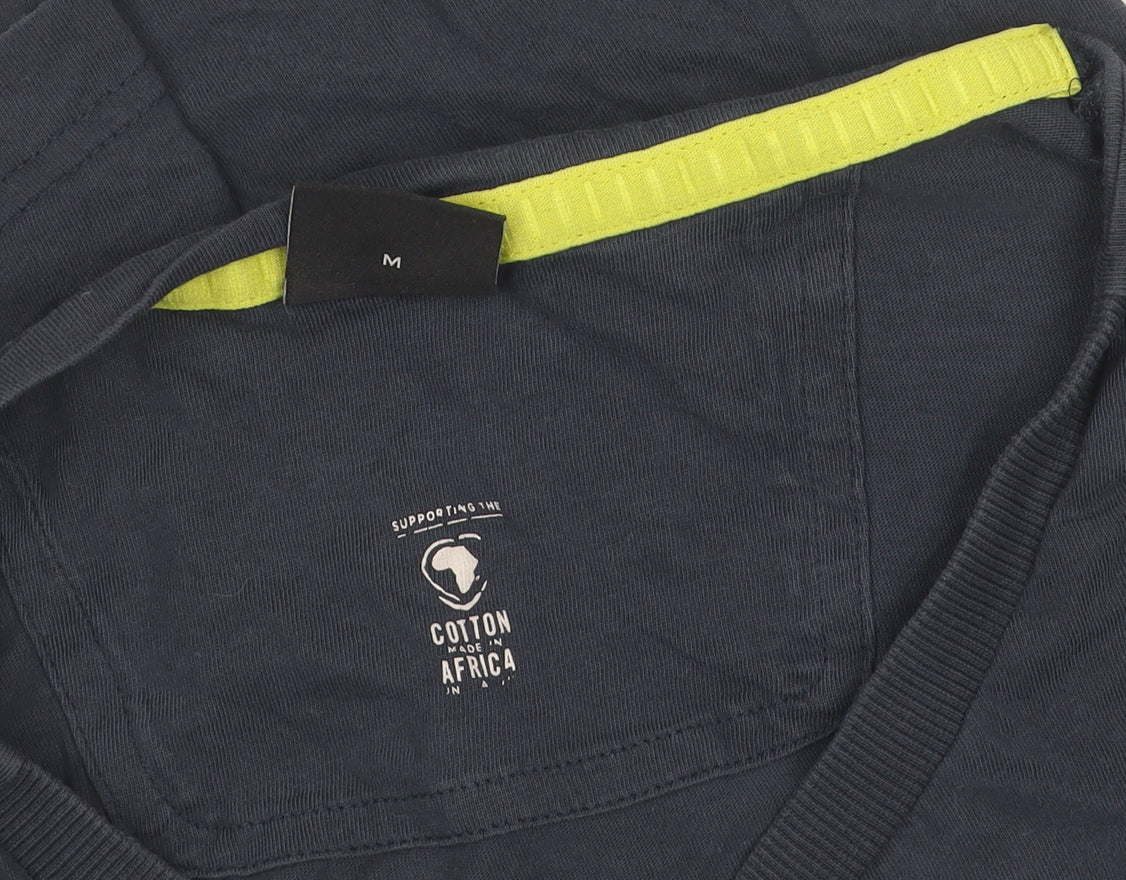 Explore the classic style and modern comfort of this Hugo Boss Men's Blue Graphic T-Shirt. Perfectly designed for everyday wear, this t-shirt is crafted from 100% cotton, ensuring a soft and breathable feel for your skin. With a regular fit and a crew neckline, it provides a comfortable and versatile wardrobe staple suited for spring, summer, and autumn. This short sleeve t-shirt showcases a bold graphic print, bringing a touch of modern edge to your casual collection. Embrace the responsible fashion movement with this piece, proudly supporting Cotton Made in Africa, reflecting Hugo Boss's commitment to sustainable practices. Ideal for men who value both style and ethics, this shirt fits comfortably within the medium size range. Slight wear is visible, yet the t-shirt remains in excellent condition, ready to enhance your wardrobe. Machine washable for effortless maintenance, this thoughtful addition to your closet is waiting to be your next favourite item. Order now and enjoy a touch of designer flair with every wear.