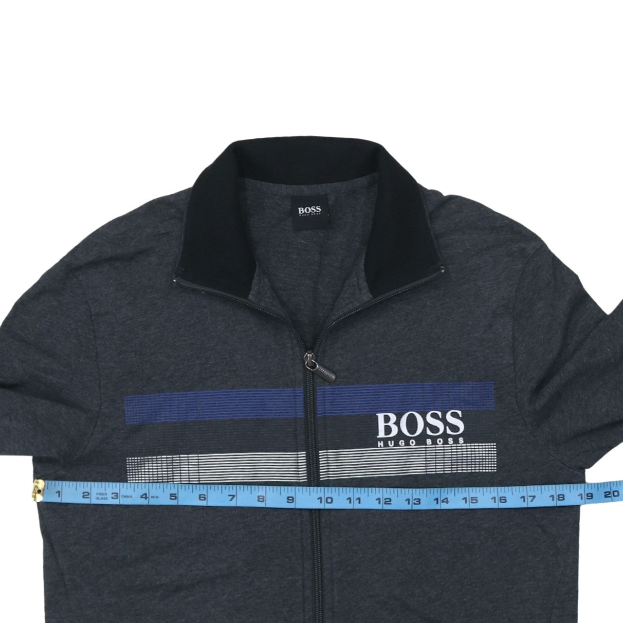 Elevate your athletic and casual wardrobe with this stylish Hugo Boss Men's Track Jacket in grey. Crafted with attention to comfort and quality, this mid-length full-zip jacket is ideal for men who value both performance and refined style. The soft jersey material blend of 70% cotton and 30% polyester provides breathable comfort, making it perfect for wearing during gym sessions, light runs, or relaxed weekends. The lightweight design ensures versatility across seasons, particularly in spring and autumn.This Hugo Boss jacket features a smart stand-up collar that adds a tailored appearance while offering extra coverage. The stylish striped detail across the chest in shades of blue and white adds a subtle modern flair to the otherwise minimalist design. With a regular fit and full-zip closure, the jacket is easy to layer over a t-shirt or under a heavier coat when the weather turns cooler.Designed for comfort, it includes breathable materials and a smooth finish that keeps you looking sharp without sacrificing function. The long sleeves and soft cuffs ensure a secure fit, while the brand’s iconic ‘BOSS Hugo Boss’ logo on the chest brings a touch of designer sophistication to your activewear collection.Ideal for activewear and casual outings alike, this jacket bridges the gap between sportswear and everyday fashion. It’s perfect for wearing to the gym, on a morning run, or simply when you want a comfortable yet refined jacket for day-to-day wear. The sleek grey shade pairs easily with jeans, joggers, or shorts, adapting effortlessly to a range of looks.This pre-owned jacket is in excellent condition with light wear and no visible faults. It offers exceptional quality and style at great value. Treat yourself or someone special to this effortlessly stylish and performance-driven Hugo Boss Track Jacket—designed to enhance your wardrobe with timeless, athletic sophistication.