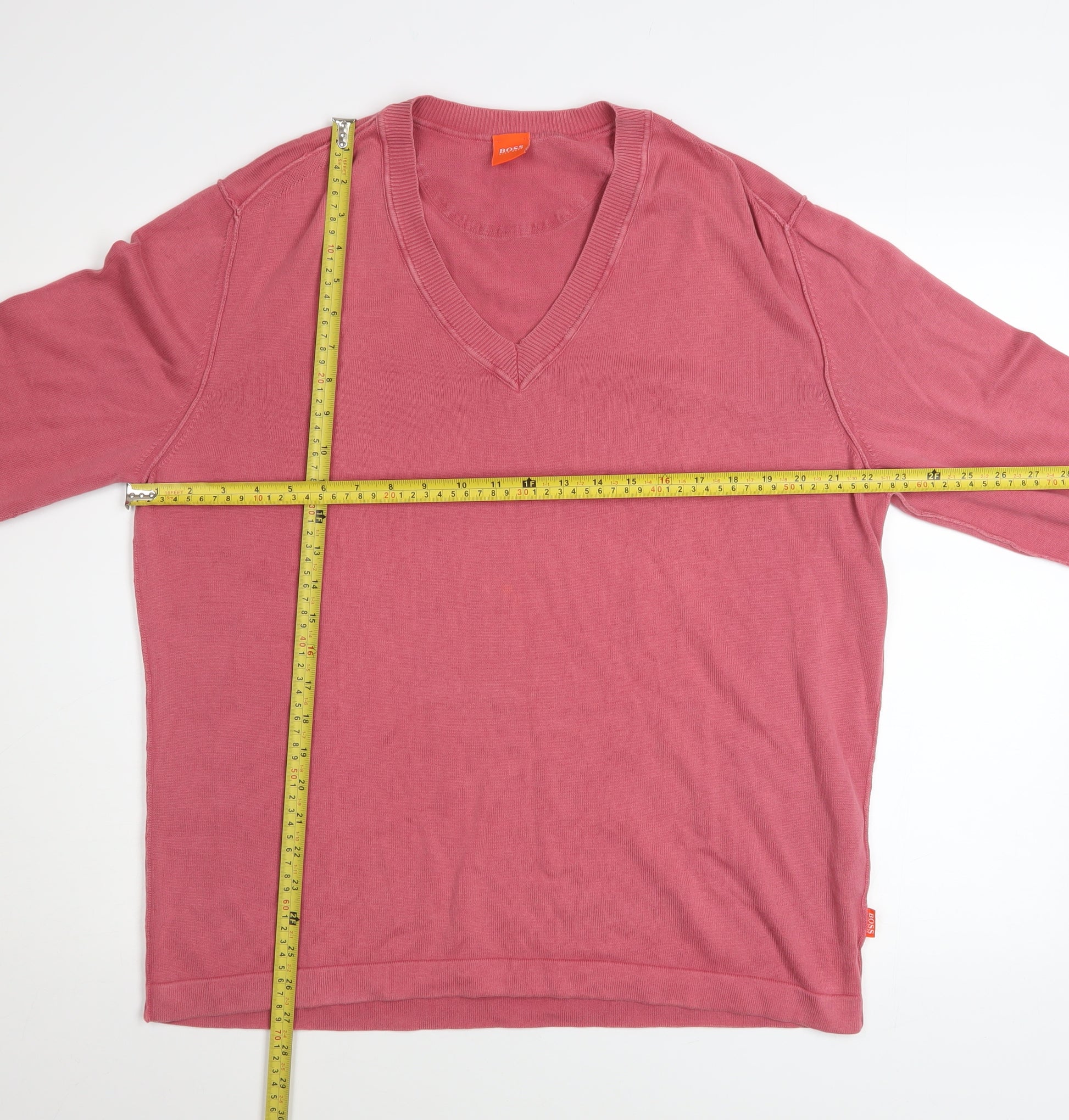 Elevate your casual wardrobe with this stylish Hugo Boss men’s pink V-neck jumper. Crafted from 100% soft cotton, this lightweight pullover provides both comfort and breathability, making it ideal for transitional seasons such as spring and autumn. Designed with a refined V-neckline and a classic tight-knit texture, it embodies the understated sophistication that Hugo Boss is known for. The jumper’s versatile regular fit ensures an easy and relaxed wear while maintaining a clean silhouette suitable for layering over shirts or wearing on its own. The long sleeves and ribbed neckline, cuffs, and hem contribute to a neatly finished design that pairs effortlessly with jeans, chinos, or tailored trousers for both smart-casual and laid-back styling. The quality craftsmanship of its breathable cotton fabric ensures long-lasting wear and a soft touch against the skin, offering all-day comfort. Presented in a distinctive pink hue, this piece adds a contemporary pop of colour to any wardrobe while remaining adaptable to a range of outfits and occasions. Perfect for everyday wear, casual social gatherings, or weekend outings, this Hugo Boss jumper effortlessly combines comfort, durability, and elegance. It shows only slight signs of general wear, preserving excellent overall condition and ready to wear for its next owner. Machine washable for easy care, this is a timeless addition to any man’s collection. A true blend of luxury and everyday practicality, it delivers a premium designer touch to your style without compromising on comfort. Pick up this Hugo Boss pink cotton V-neck jumper today to enhance your outfit rotation with classic sophistication and effortless charm.