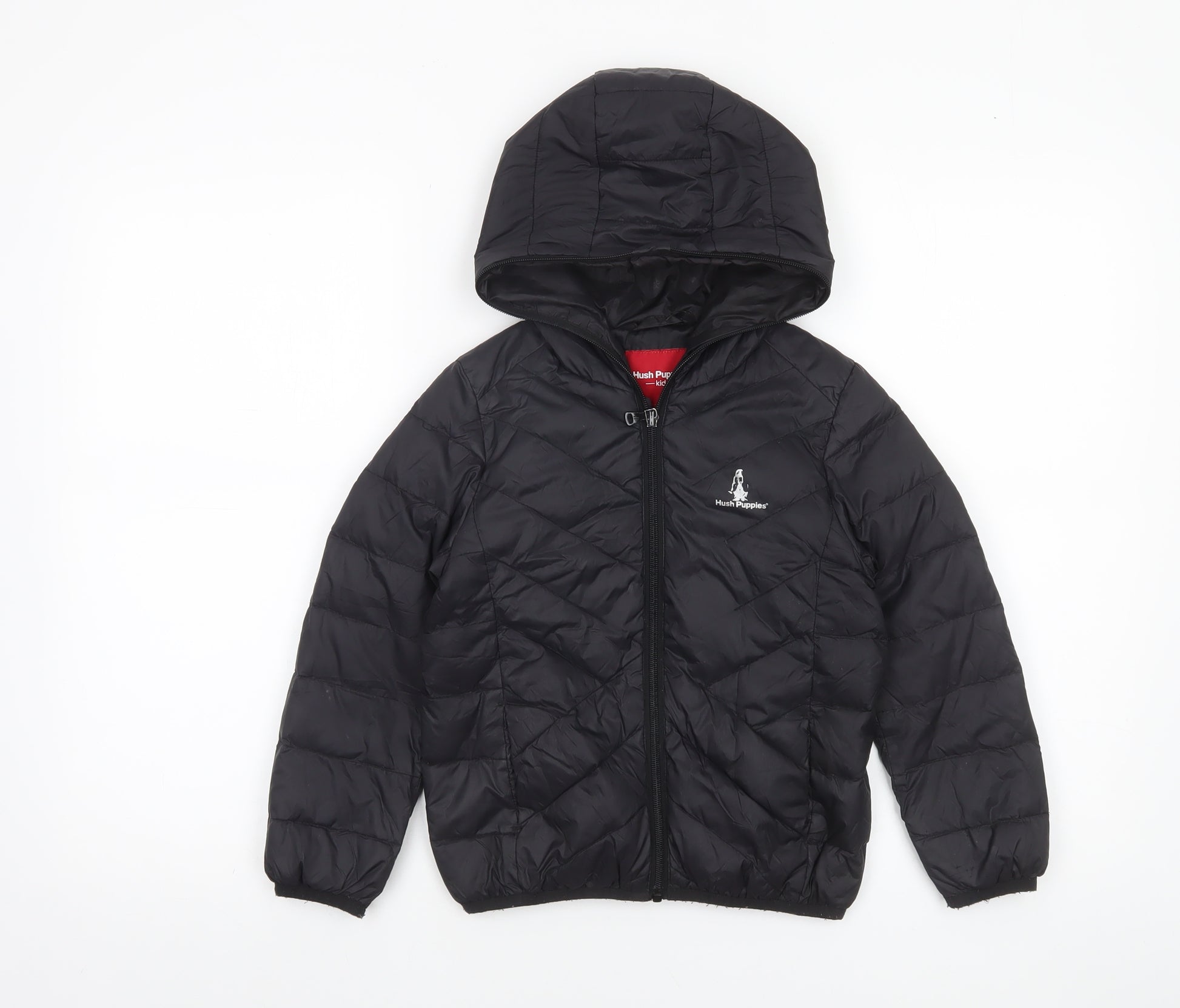 Keep your little one warm and comfortable in this stylish Hush Puppies boys’ black padded puffer jacket. Perfectly designed for autumn and winter weather, this lightweight yet cosy coat combines practicality with signature Hush Puppies quality. Made from durable polyester with soft synthetic insulation, it offers excellent warmth while remaining breathable and easy to wear. The sleek black tone makes it a versatile piece that pairs effortlessly with any casual outfit.This jacket features a secure full zip fastening, practical hood for added protection, and elastic cuffs to keep out the chill. The quilted design not only ensures even insulation but adds a modern, textured look to this classic outerwear piece. Its short length provides freedom of movement, making it ideal for everyday adventures, school runs, and weekend outings. Inside, the jacket is fully lined for extra comfort, while the lightweight polyester shell is both hard-wearing and machine washable for fuss-free care.Suitable for boys aged around 4 to 5 years (110cm height), this regular-fit jacket has been well cared for and remains in excellent condition with no visible flaws or damage. Though pre-owned, its durable build and timeless design ensure it will continue to look great and perform well through the colder seasons. Offering both warmth and style, this Hush Puppies puffer jacket is a must-have layering piece for any young wardrobe — a dependable choice for active kids who love playing outdoors while staying snug and stylish.Whether teamed with jeans, joggers, or school trousers, it’s a versatile winter essential you can rely on. Get the trusted comfort and quality of Hush Puppies without the new price tag.