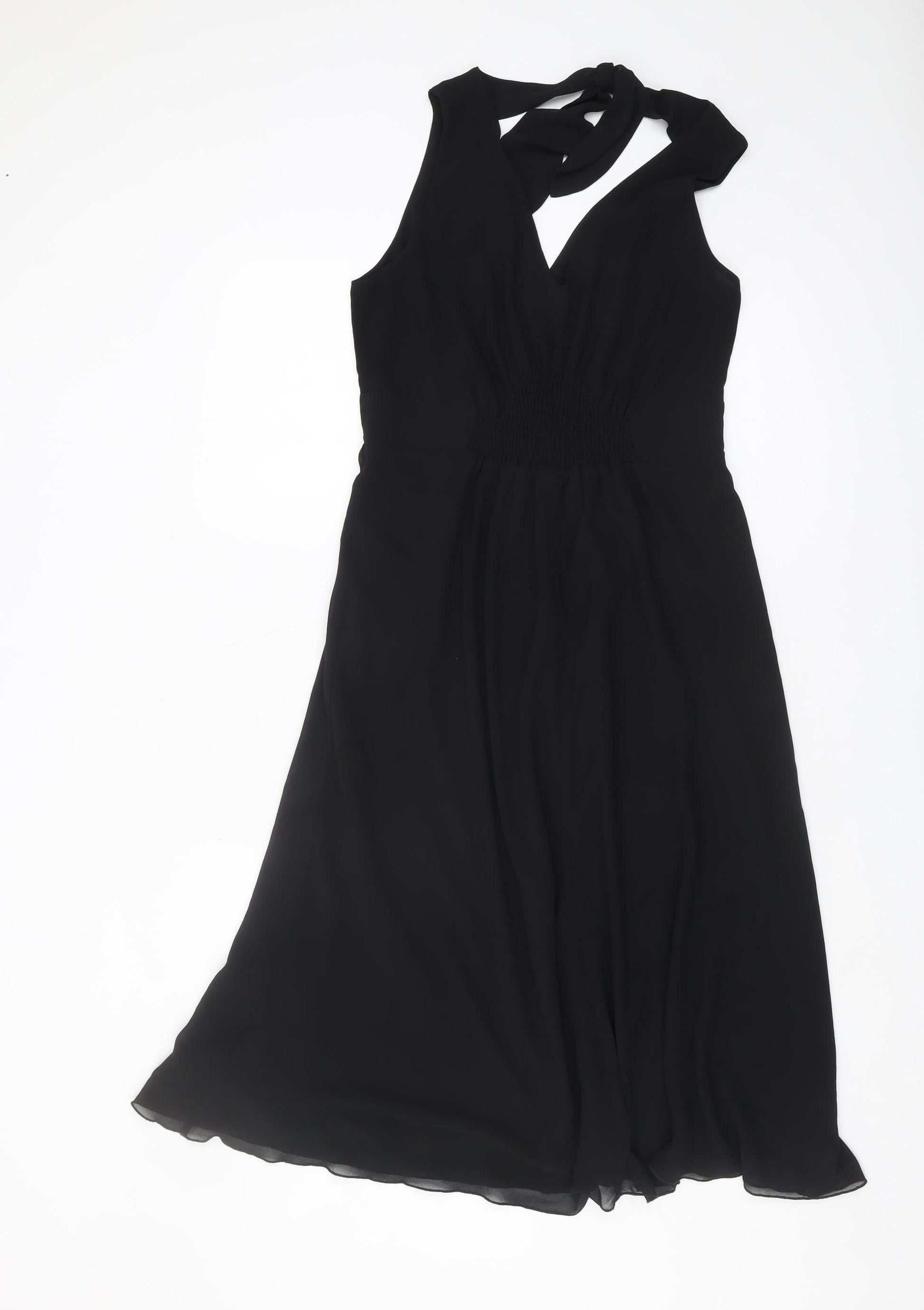 Elevate your wardrobe with this chic and sophisticated black halter dress by hush. Designed for women and sized at UK 8, this dress exudes elegance and charm, perfect for a variety of occasions. Crafted entirely from polyester, it offers a comfortable fit with a woven fabric type, ensuring durability and style. The sleeveless design creates a classic and versatile look, ideal for layering or wearing on its own during warmer seasons. The halter neckline adds a touch of glamour, making it suitable for both casual and more formal settings. Whether you're heading to a special event or simply enjoying a night out, this dress guarantees to make a statement. In an excellent used condition, it shows no visible flaws and is ready to be worn and loved by its new owner. Pair with your favourite accessories to complete your stunning ensemble. Priced competitively at £35.00, this dress combines quality and value effortlessly, promising to be a standout piece in any fashion collection.