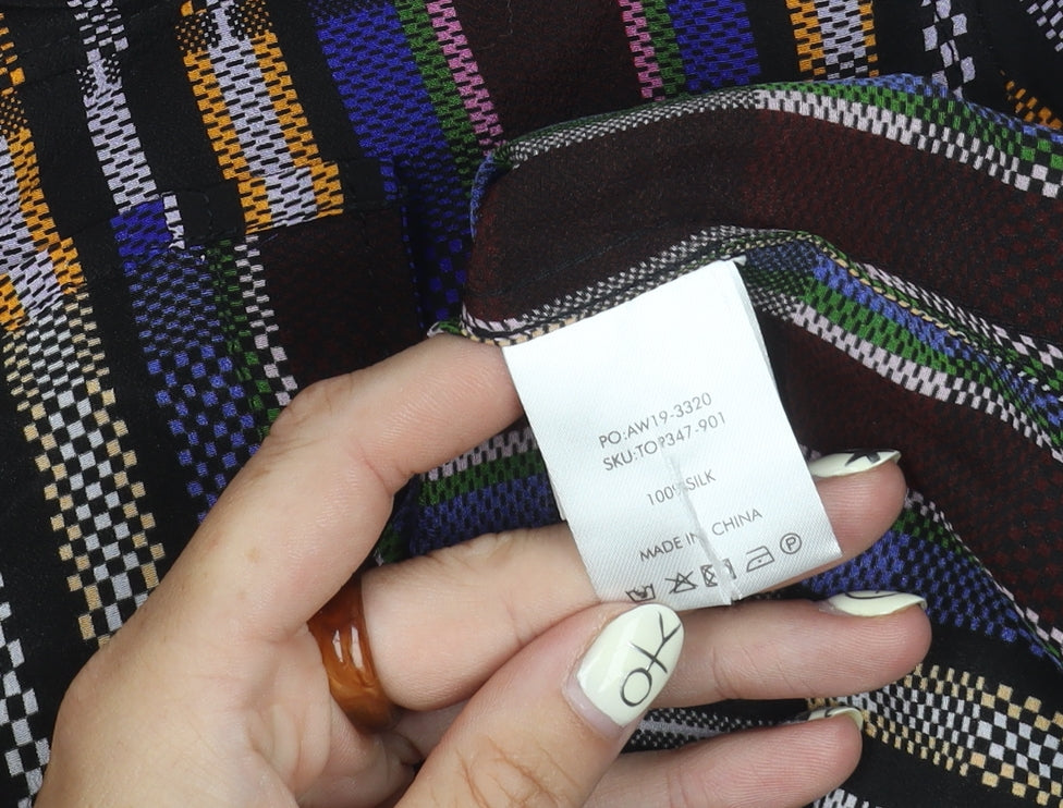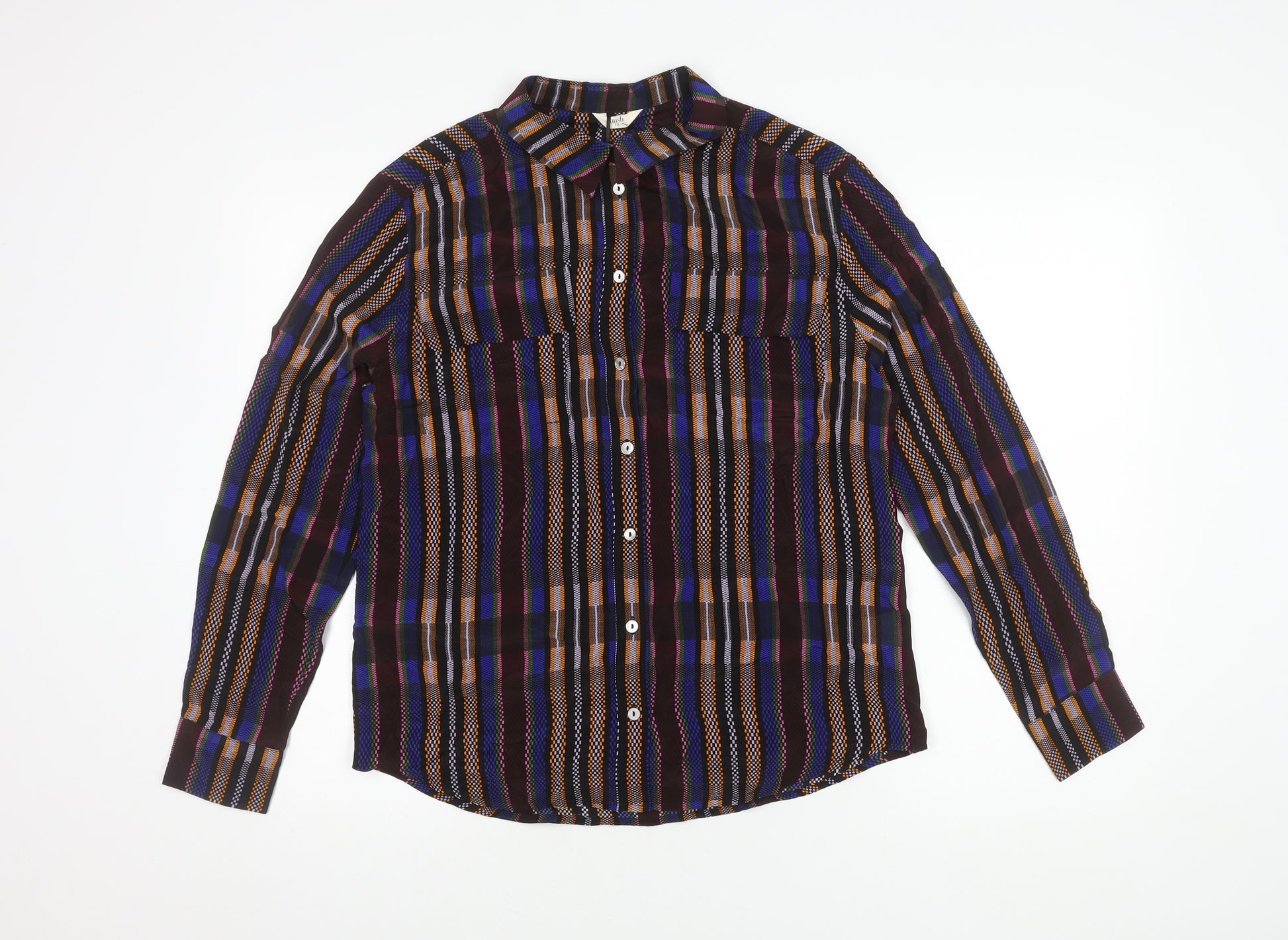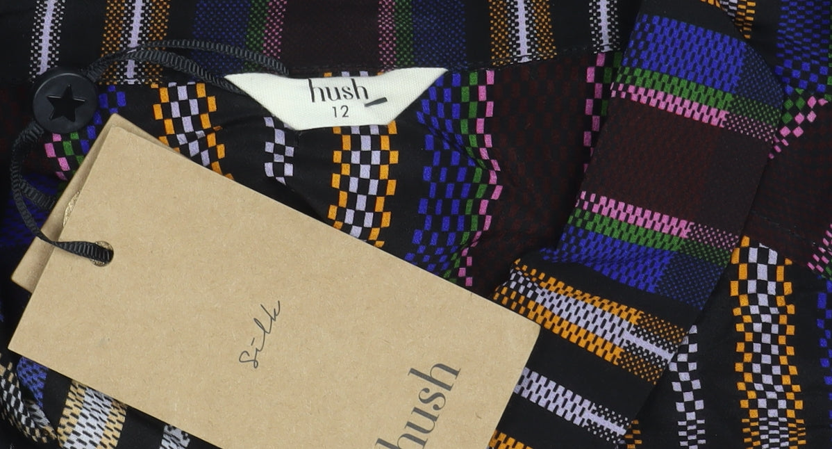 Elevate your wardrobe with this chic Hush Women's Multicoloured Button-Up Shirt. Crafted from 100% silk, this elegant piece offers a luxurious touch to any outfit. Featuring a vibrant geometric pattern, it's perfect for adding a pop of colour to your ensemble. Designed for a regular fit, this shirt is ideal for women seeking style and comfort. The long sleeves and collared neckline enhance its classic appeal, making it suitable for both casual outings and more polished occasions. The button closure ensures ease of wear, while the new with tags condition guarantees impeccable quality. This shirt is a must-have for fashion-forward individuals who appreciate a blend of contemporary design and timeless elegance. Don't miss the chance to own this standout piece that effortlessly transitions from day to night, capturing attention with its striking multicoloured design.