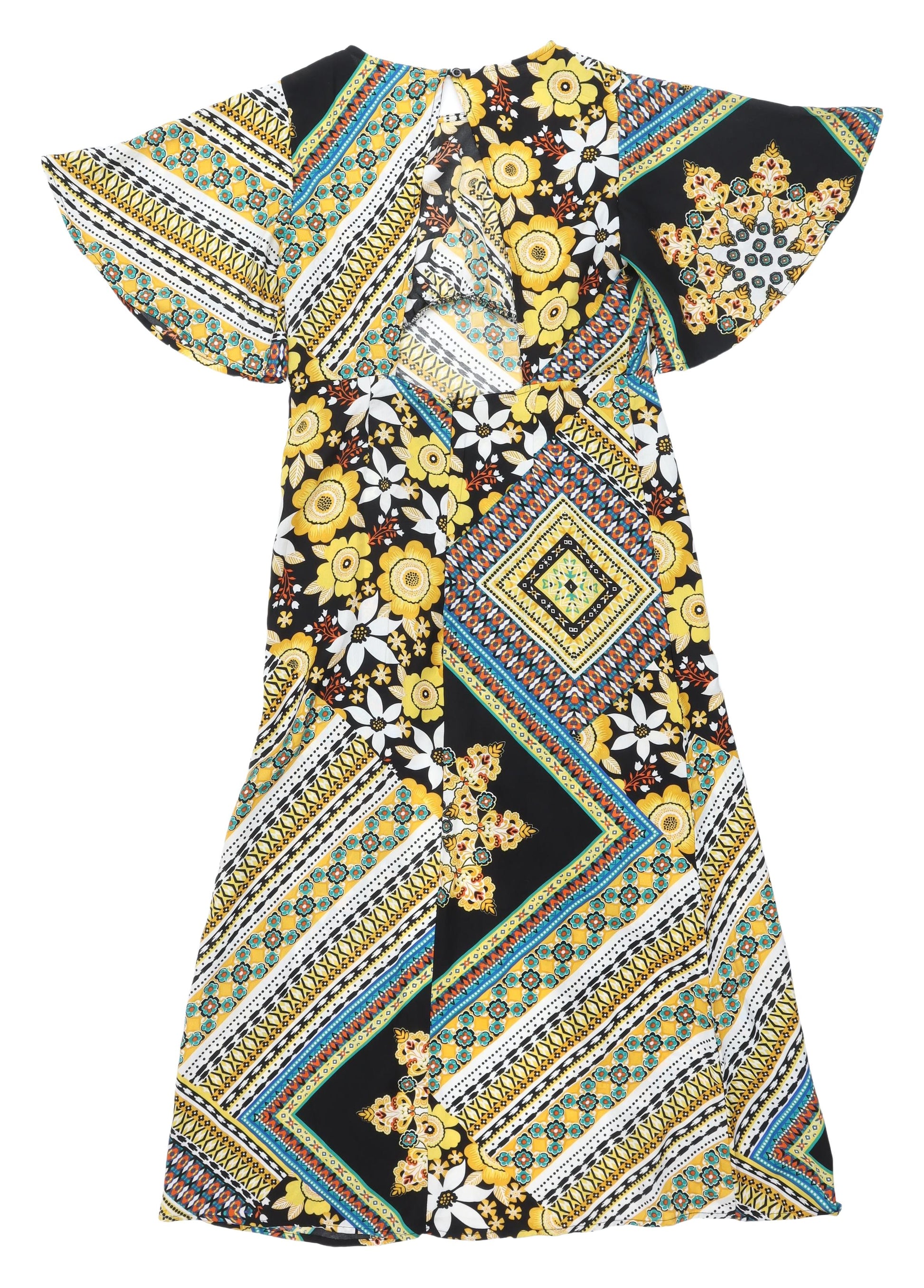 Elevate your wardrobe with this chic and eye-catching dress from In Vogue Paris. Perfectly designed for women who love a touch of bohemian flair, this multicoloured dress features a vibrant mix of floral and geometric patterns. Its A-line silhouette ensures a flattering fit, while the midi length offers a versatile option for both casual and cocktail occasions. Crafted from lightweight, breathable polyester, this dress promises comfort and style during the warmer months. The flutter sleeves and round neckline add a playful touch, making it a standout piece for any fashion-forward woman. Whether you're heading to a garden party or a casual lunch date, this dress will make you feel effortlessly elegant and confident. Pair it with your favourite heels or sandals to complete the look. Don't miss out on adding this stylish piece to your collection.