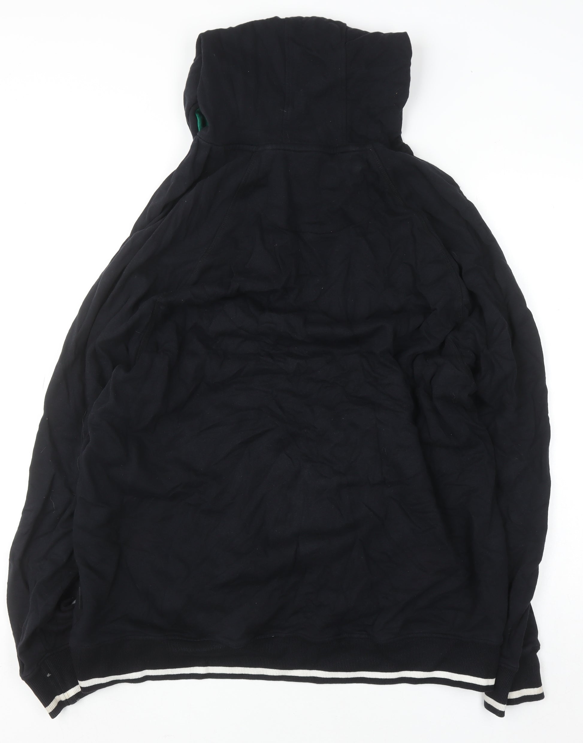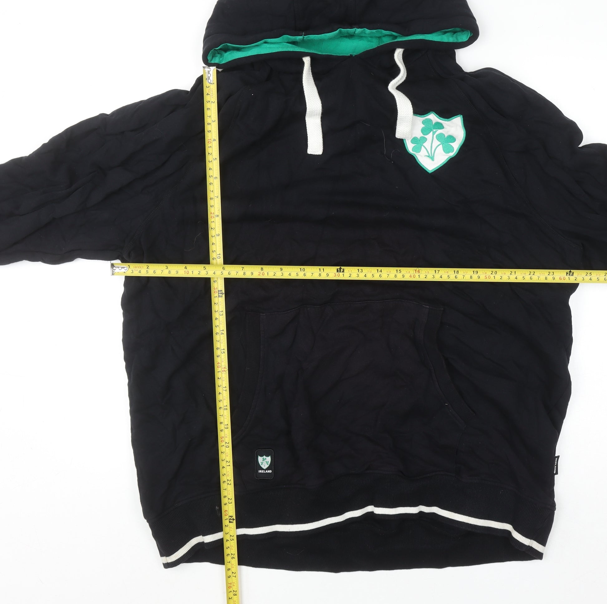 Celebrate your Irish pride in style with this Ireland Classics men's black pullover hoodie. Crafted from 100% soft cotton jersey, this comfortable and durable hoodie provides a relaxed fit ideal for casual wear and sporting activities alike. The clean black design is complemented by green accents inside the hood and a bold shamrock crest printed on the chest, giving it a distinctive athletic look inspired by classic Irish sportswear. Featuring a drawstring hood and a kangaroo pocket for convenience, it is perfect for layering during cooler seasons such as autumn and winter. The sturdy ribbed cuffs and hem add not only durability but also a comfortably snug fit around the wrists and waist. Designed in a men’s 2XL size, it offers an easy, roomy fit that works just as well for everyday wear as it does for leisure activities like watching the match or casual outings. With machine washable cotton material, this piece is as easy to care for as it is to wear. The ‘Ireland Classics’ branding and signature shamrock emblem bring a patriotic and sporty touch that will appeal to fans of Irish heritage and rugby-inspired fashion. In excellent used condition with only light signs of wear, this hoodie offers great quality and style without compromise. Whether you’re supporting your team, heading out for a walk, or staying cosy at home, this hoodie makes a versatile and meaningful addition to the modern casual wardrobe. Pair it with jeans, joggers, or shorts for an effortless, relaxed look. A great garment for expressing both style and comfort, this Ireland Classics pullover hoodie is a reliable and timeless wardrobe essential for any man who appreciates Irish charm and casual sports style.