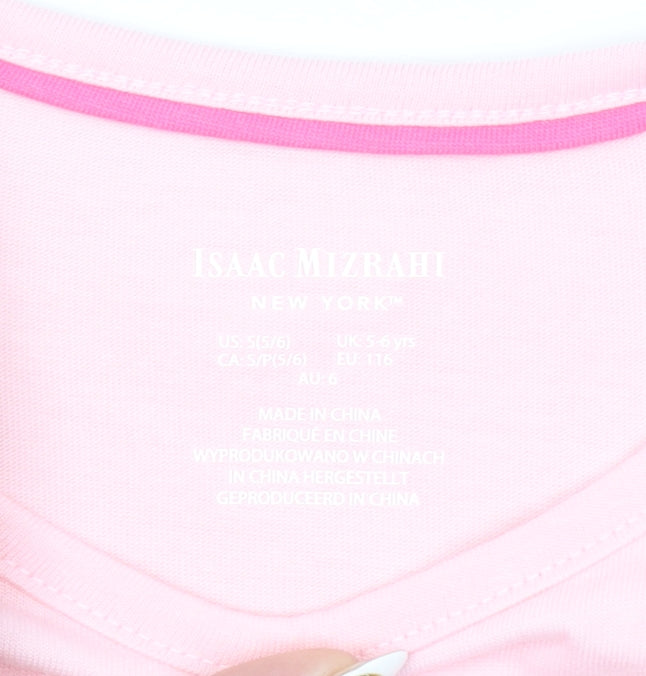 Add a glamorous touch to your little one's wardrobe with this adorable pink sequin bow T-shirt by Isaac Mizrahi New York. Designed for girls aged 5-6 years, this long sleeve top combines comfort and charm in one delightful piece. The soft cotton blend fabric feels gentle against the skin, while the added polyester ensures durability and easy care — perfect for everyday wear. The pretty pink shade provides a sweet, playful look, and the glittering sequin bow accent at the front gives it that extra sparkle every young fashionista will adore. Crafted in a regular fit with a classic crew neckline and long sleeves, it offers both comfort and style, making it suitable for layering in cooler months or wearing on its own during spring or autumn. The jersey knit fabric allows for breathability and flexibility, making this top perfect for casual occasions, playdates, and school days alike. With its lightweight construction, it’s ideal for active kids who love expressing themselves through their clothing. The machine washable material makes caring for this garment simple for busy parents. Despite being pre-loved, the T-shirt remains in excellent condition with no visible flaws, ensuring it looks and feels fresh for its next wearer. This charming piece embodies a fun and youthful aesthetic, combining a classic pink hue with an eye-catching design that’s cute, comfortable, and full of personality. Whether you’re looking for a standout piece for a casual outing or a comfy top that still brings a hint of sparkle, this Isaac Mizrahi sequin bow T-shirt is the perfect addition to any young girl’s wardrobe. Affordable, stylish, and full of joy — a must-have fashion piece that shines bright for seasons to come.