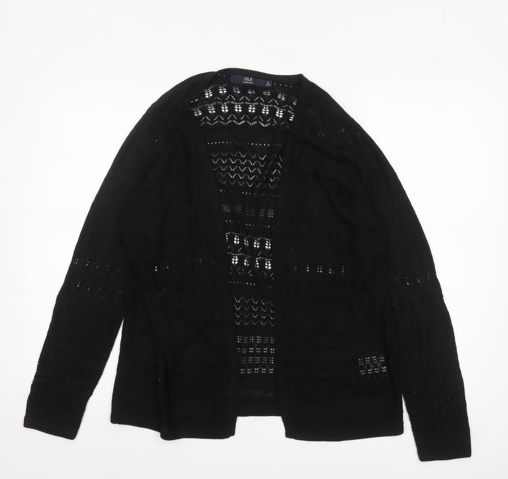 This Isle Essentials women's black open-knit cardigan is an elegant and versatile layering piece designed for comfort and effortless style. Crafted from a soft blend of viscose and acrylic, it offers a lightweight and breathable feel perfect for transitional seasons such as spring and autumn. The cardigan features a delicate open-knit pattern that adds texture and sophistication, ideal for pairing with both casual and refined outfits. Its open-front design allows for easy layering over tops or dresses, while the long sleeves lend warmth and a relaxed silhouette suitable for various occasions. Designed in size S (UK 10–12), it provides a comfortable regular fit that flatters without restricting movement. The classic black colour ensures timeless appeal, making it a wardrobe essential for both day and evening wear. The viscose and acrylic mix gives it an attractive drape and durability, ensuring a soft touch against the skin. The cardigan is machine washable, combining convenience with practicality. Ideal for casual and semi-smart looks alike, this piece works beautifully with jeans, skirts, or tailored trousers. Whether you're dressing for a workday or a weekend outing, it adds understated elegance to your outfit. Beautifully constructed with attention to detail, the Isle Essentials cardigan showcases quality craftsmanship synonymous with Edinburgh Woollen Mill’s trusted reputation. It remains in excellent pre-owned condition, showing no signs of damage or wear. With its open-knit structure and timeless silhouette, this cardigan is a must-have layering essential that can transition smoothly between seasons and occasions. A versatile addition to any wardrobe, promising style, comfort, and sophistication in equal measure.