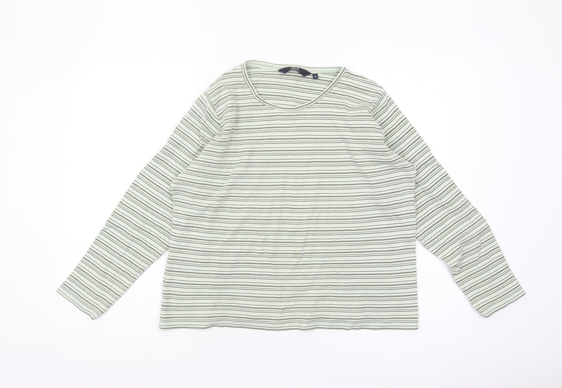Embrace effortless style with the ISLE Essentials Women's Grey Striped T-Shirt. Crafted from 100% cotton, this jersey fabric T-shirt offers the ultimate in breathable comfort and easy care, making it an ideal choice for casual, laid-back days. Designed with a classic fit and long sleeves, this top is perfect for layering during the transitional months of spring and autumn. The grey stripes provide a timeless pattern, adding a subtle yet stylish touch to your everyday wardrobe.The round neck and pullover closure ensure a relaxed and comfortable fit, while the classic/fitted sleeve design adds a touch of elegance. Whether you're pairing it with jeans for a casual outing or wearing it under a jacket for a more polished look, this versatile T-shirt is bound to become a staple in your collection.With a regular size medium fit, this top from ISLE Essentials caters to women who appreciate both style and comfort. Machine washable, it promises convenience with every wear, maintaining its quality wash after wash. Although it shows light wear due to being pre-loved, it remains in excellent condition, ready to bring a fresh breath of style to your ensemble.Ideal for casual occasions, this grey T-shirt aligns perfectly with your relaxed lifestyle, offering a seamless blend of simplicity and sophistication. Add this essential piece to your collection for a reliable go-to option that guarantees both fashion and function.