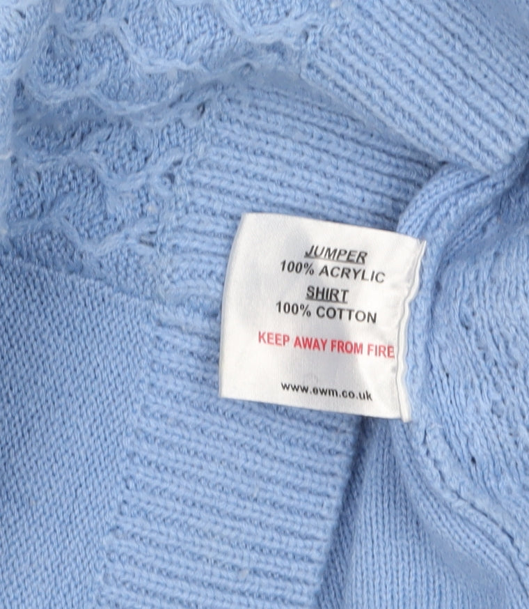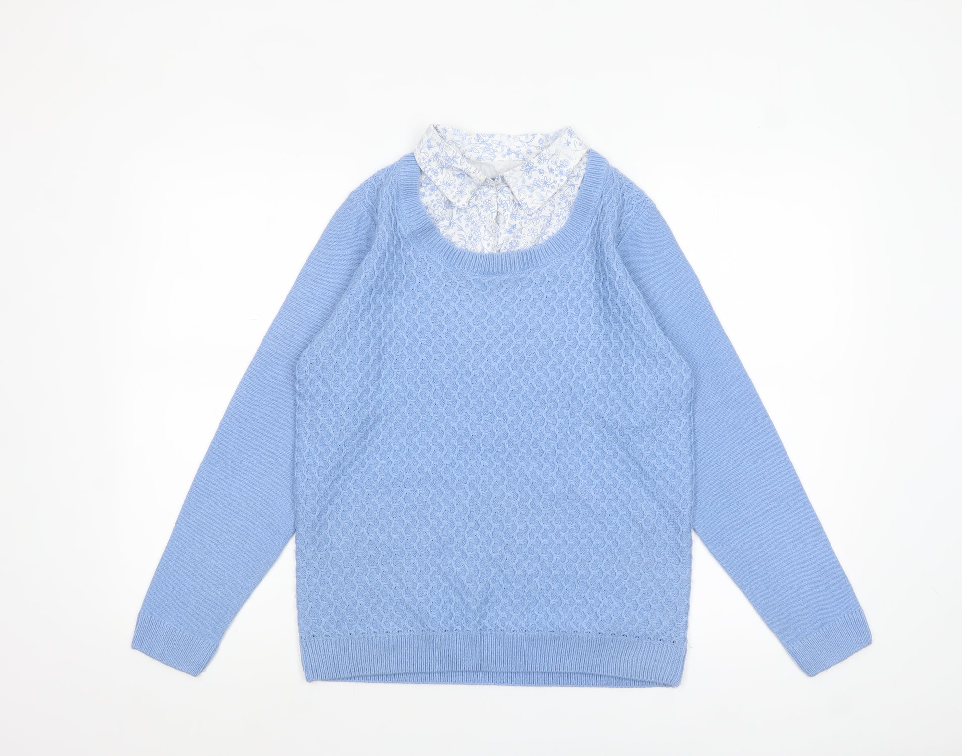 This elegant ISLE women's pullover jumper in a soft blue hue offers timeless style and everyday comfort. Designed for a flattering regular fit, the jumper features a textured tight-knit front panel paired with smooth knit sleeves and back. The lightweight construction makes it perfect for layering during cooler months, while the pretty blue and white mock shirt collar detail adds a touch of femininity and sophistication. Crafted from 100% acrylic, this jumper combines warmth with easy care, making it machine washable for convenience and durability. The design is completed with a crew neckline and long sleeves, ideal for a relaxed yet polished look suitable for casual occasions, workwear, or day-to-day wear. Whether styled with jeans for a laid-back outing or smart trousers for a more refined ensemble, this versatile piece transitions seamlessly between seasons, offering cosy comfort and effortless charm. The soft pastel colour enhances its gentle aesthetic, appealing to those who appreciate subtle elegance in their wardrobe essentials. Its classic silhouette and quality knit construction from ISLE ensure long-lasting wear, providing both practicality and style. In excellent pre-owned condition, this jumper shows minimal signs of wear with no visible stains or damage. This piece is perfect for autumn, winter, or early spring layering and represents excellent value for quality craftsmanship. A beautiful addition to any collection, this ISLE light blue crew neck jumper blends comfort and charm in one timeless garment that you will love to wear season after season.