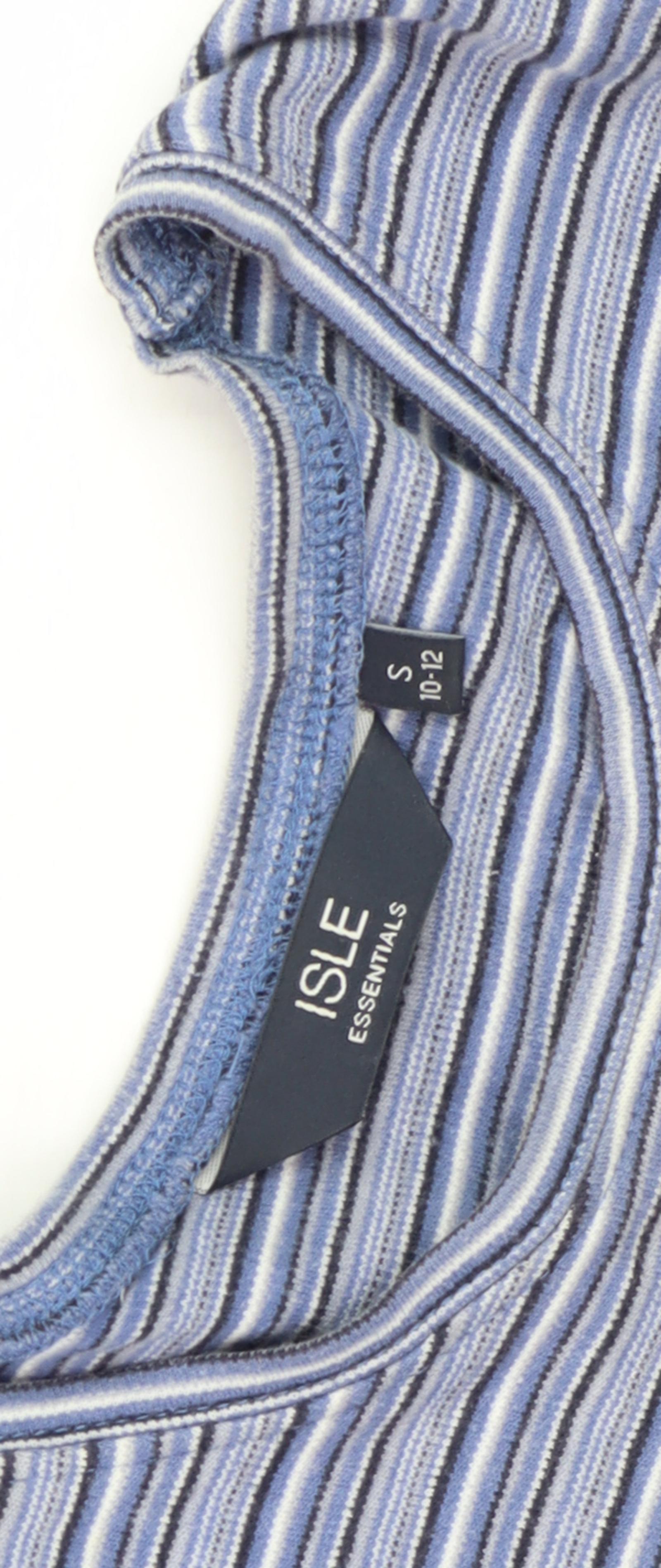 Elevate your casual wardrobe with this ISLE Women's Blue Striped Long Sleeve T-Shirt, perfect for a variety of occasions. Crafted from a comfortable blend of Cotton and Elastane, this jersey fabric top provides a soft and stretchy feel, ensuring all-day comfort. The regular fit and classic crew neck design offer a timeless look that pairs effortlessly with any outfit. This versatile piece is ideal for all seasons, featuring a stylish blue striped pattern that adds a touch of elegance to your daily attire. Its long sleeves and fitted style make it suitable for both work and leisure, offering a flattering silhouette that complements every body type. Easy to care for and machine washable, this t-shirt is designed to be both practical and stylish. Whether you're heading out for a day in the city or relaxing at home, this ISLE Women's Blue Striped Long Sleeve T-Shirt is a must-have addition to your collection. With light wear and no visible damage, the condition is marked as excellent, providing great value for a smart, casual choice.