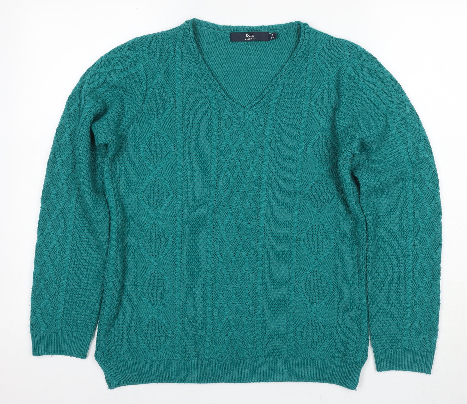Add a touch of warmth and comfort to your wardrobe with this beautiful ISLE Women's Jumper in a stunning green hue. Perfect for autumn and winter, this pullover is designed for casual occasions, ensuring you stay cosy without compromising style. Crafted from 100% acrylic, it offers the softness and durability needed for everyday wear. Its classic V-neckline and cable-knit pattern give it a timeless appeal that pairs effortlessly with any outfit. Whether you're heading out for a day in the city or a relaxed evening with friends, this jumper provides the perfect balance of comfort and style. Featuring long sleeves and a regular fit, it's ideal for layering under jackets or wearing on its own. Despite being gently worn, it remains in excellent condition and presents no visible flaws. Experience the versatility and chicness this ISLE jumper brings to your ensemble.