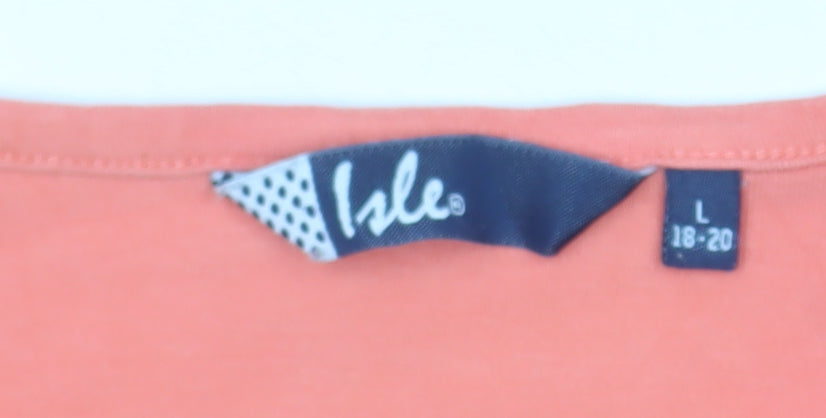 Refresh your casual wardrobe with this Isle women’s coral-orange T-shirt, perfect for easy everyday wear. Crafted from 100% cotton jersey, this lightweight and breathable top offers a soft, comfortable feel against the skin — ideal for warmer days or for layering during cooler months. Designed in a flattering relaxed fit, it features short sleeves, a classic round neckline with subtle cut-out detailing, and a smooth pullover style for effortless wear.The bold yet wearable orange hue adds a bright pop of colour to your outfit, pairing beautifully with jeans, shorts, or skirts for a versatile look that transitions from day to evening with ease. Made in a simple solid pattern, it’s a timeless wardrobe essential with just the right amount of interest at the neckline to keep things stylish yet understated.This Isle top is a women’s UK size L (18–20), made to flatter a fuller figure while providing freedom of movement without losing shape. Its short sleeves and soft jersey fabric make it an ideal pick for spring and summer wear, while the breathable cotton construction ensures comfort throughout the day. Perfect for casual occasions, travel, or relaxed weekend style.Although pre-owned, this garment remains in good overall condition with only a small hole noticed near the hemline — otherwise, it has been well cared for and retains its quality structure and colour vibrancy. Machine washable for easy care, it’s a durable choice for everyday wear.Add effortless polish to your everyday looks with this Isle cotton T-shirt — a great choice for those who love the combination of comfort, colour, and simplicity in a staple wardrobe piece.