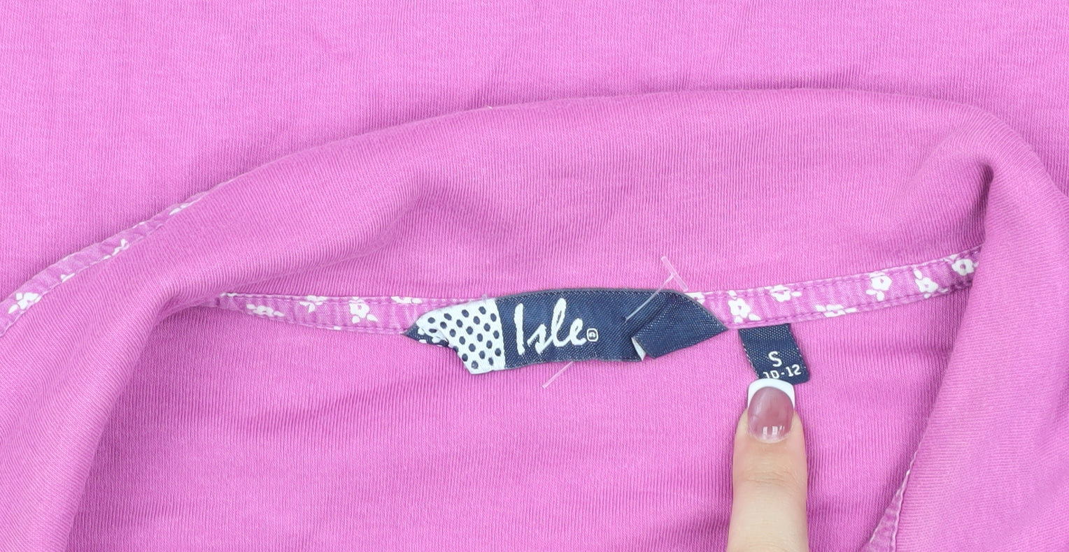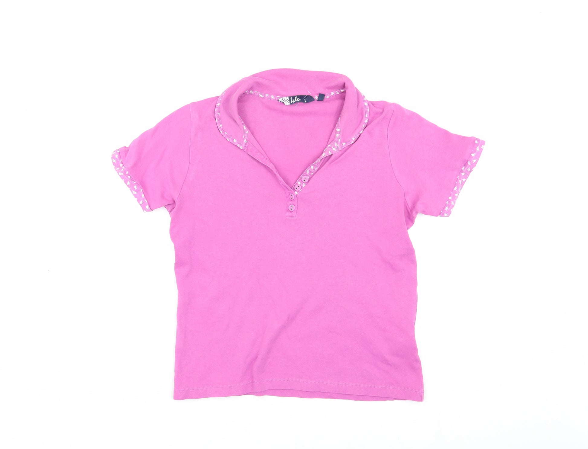 This Isle Women's Polo Shirt in a vibrant pink hue is perfect for casual outings. Featuring a comfortable collared neckline and short sleeves, it offers both style and comfort. Made from 100% cotton jersey fabric, it's breathable and suitable for all seasons. The shirt's regular fit and solid pattern make it a versatile piece that can be easily paired with jeans or a skirt for a relaxed look. Accented with buttons, it has a feminine touch. Perfect for spring and summer, this polo shirt is ideal for casual occasions. Though in excellent condition with slight wear evident, it offers a fantastic addition to your wardrobe at an affordable price. Easy to care for, this machine washable shirt provides practicality without compromising style. Grab this comfortable and chic polo shirt and elevate your casual ensemble.