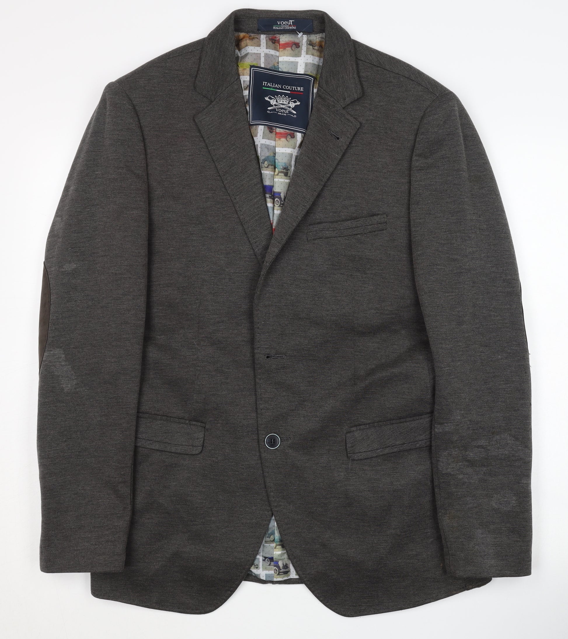 Elevate your wardrobe with this stylish Italian Couture Men's Grey Blazer. Tailored for the modern man, this single-breasted blazer is perfect for various occasions, adding a touch of sophistication to any outfit. Made from 100% cotton, it offers comfort and durability, featuring a regular fit for optimal wearability. The blazer is crafted with a notch lapel style and a two-button front, enhancing its classic and timeless appeal. The integral elbow patches add a touch of flair, while the subtle grey hue ensures versatility, allowing it to be paired easily with different trousers and shirts. With a polyester lining, the blazer offers a comfortable and smooth feel, ensuring you stay stylish throughout the day. Its condition is graded as very good, with slight marks on the sleeves that do not detract from the overall charm. This blazer is ideal for both casual and semi-formal occasions, making it a versatile addition to your collection. Standing out with its meticulous Italian craftsmanship, this blazer is a wardrobe staple for the fashion-forward individual. Don't miss your chance to enhance your style effortlessly with this elegant Italian Couture blazer, designed to make you look sharp and confident.