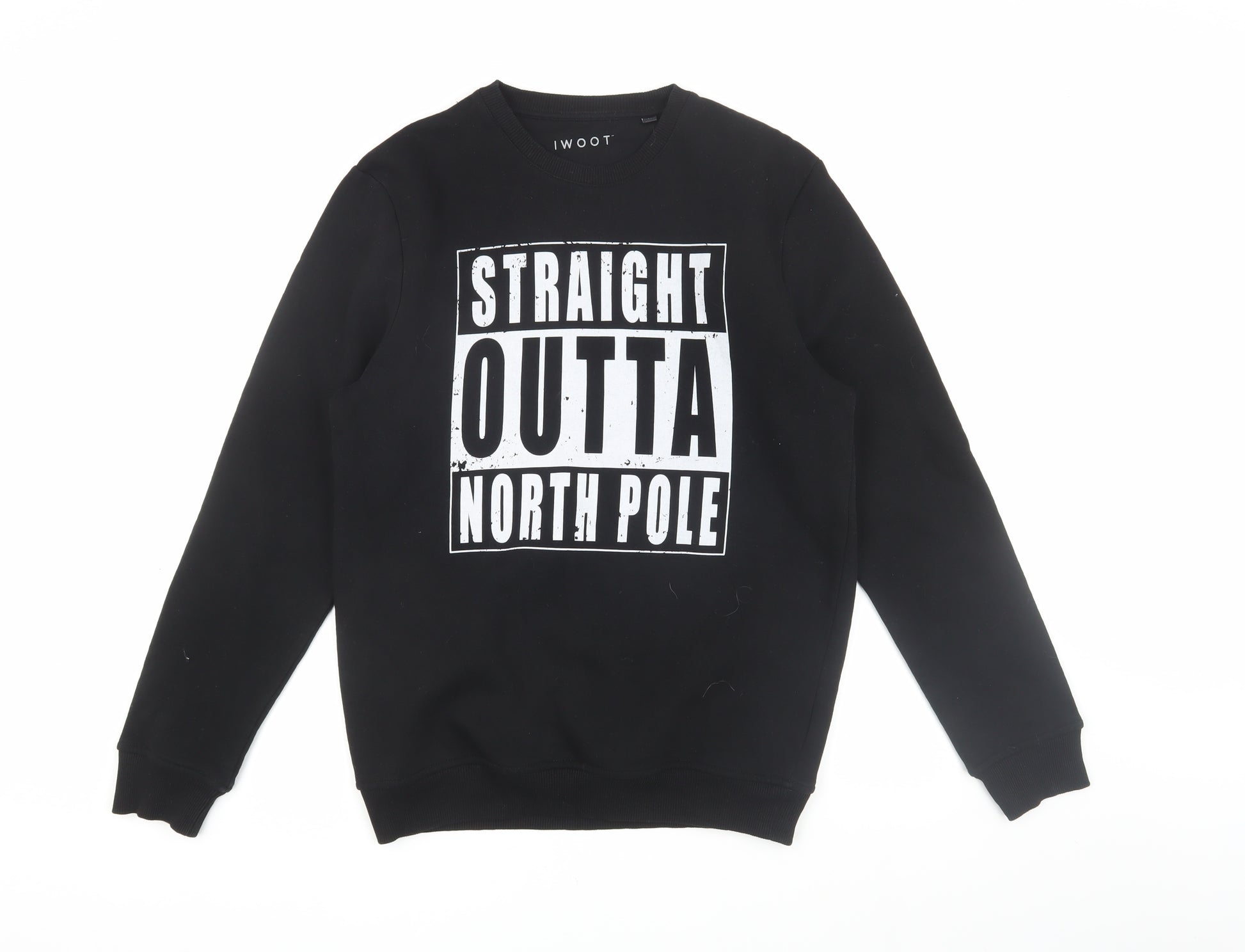 Celebrate the holiday spirit with this stylish black sweatshirt by IWOOT. Perfect for the festive season, it features a bold 'Straight Outta North Pole' graphic print, ensuring you stand out. Tailored for comfort, this pullover sweatshirt is crafted from a soft blend of 70% cotton and 30% polyester, providing a lightweight yet warm feel ideal for the autumn and winter months. With its regular fit and classic crew neckline, it ensures versatility and style, suitable for a range of casual outings. Ideal for Christmas gatherings or lounging at home, this piece is easy to style with jeans or joggers for a laid-back look. Machine washable for convenience, it’s designed for effortless care, keeping your wardrobe fresh and ready for all your seasonal activities. Slightly pre-owned but maintaining an 'excellent' condition, it shows minimal signs of wear, offering you both quality and value. Whether you're gifting a loved one or treating yourself, this sweatshirt is a fantastic find that encapsulates festive fun. Pair it with your favourite sneakers or boots to complete the outfit. Make this festive staple a part of your collection today and enjoy a blend of comfort, style, and holiday cheer.
