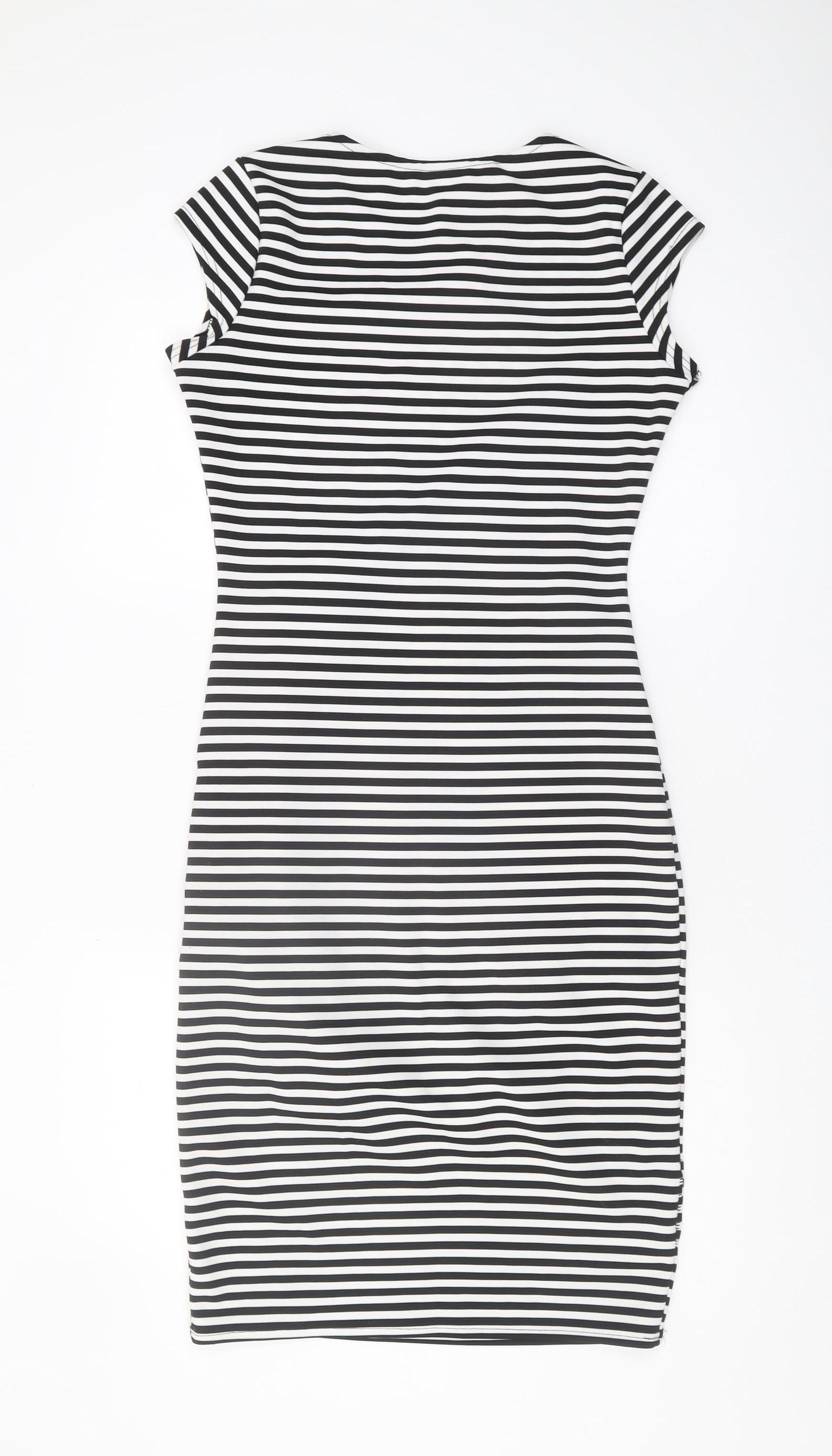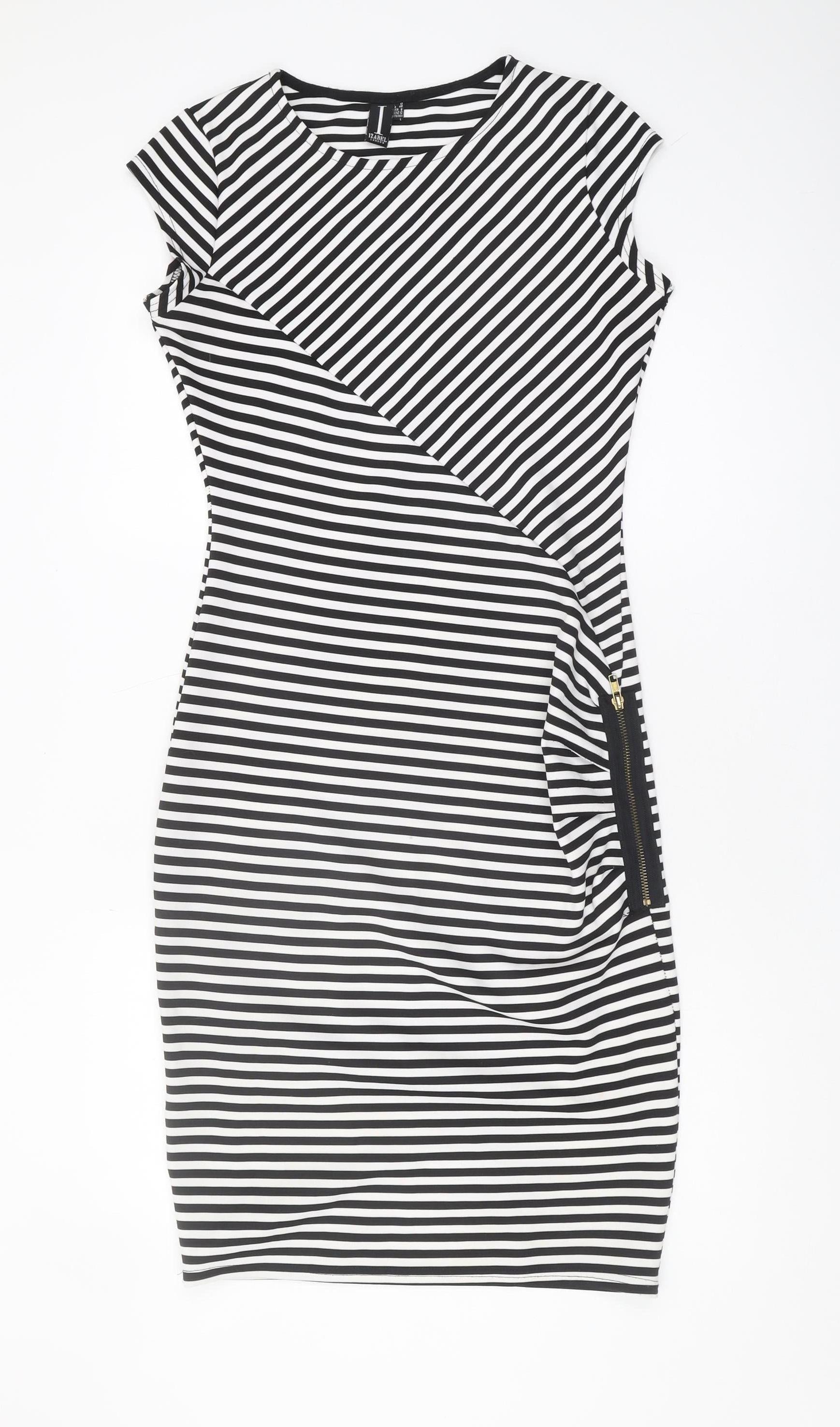 Step into sophistication with this Izabel London women's dress, perfectly tailored for those seeking a chic and modern look. Featuring classic black and white stripes, this dress is ideal for making a stylish statement. The dress is cut in a flattering regular size 12 and offers a zip closure for easy wearing and a streamlined fit. A versatile addition to any wardrobe, this dress can effortlessly transition from day to night, adding elegance to any occasion. Perfect for casual outings or workwear, its timeless pattern ensures it remains a staple piece. The material feels comfortable, making it suitable for all-day wear. With no visible flaws, this gently used dress is in excellent condition, offering you exceptional value. Embrace the stripe trend and refresh your collection with this eye-catching piece. Don't miss out on adding this versatile dress to your wardrobe.