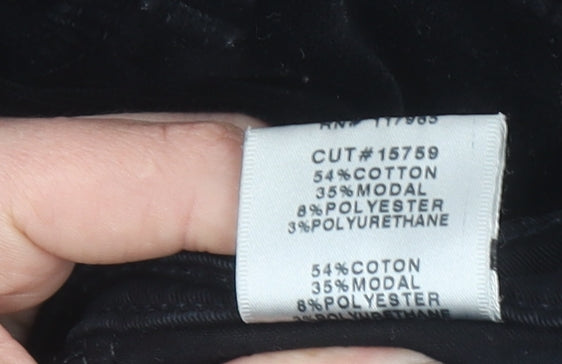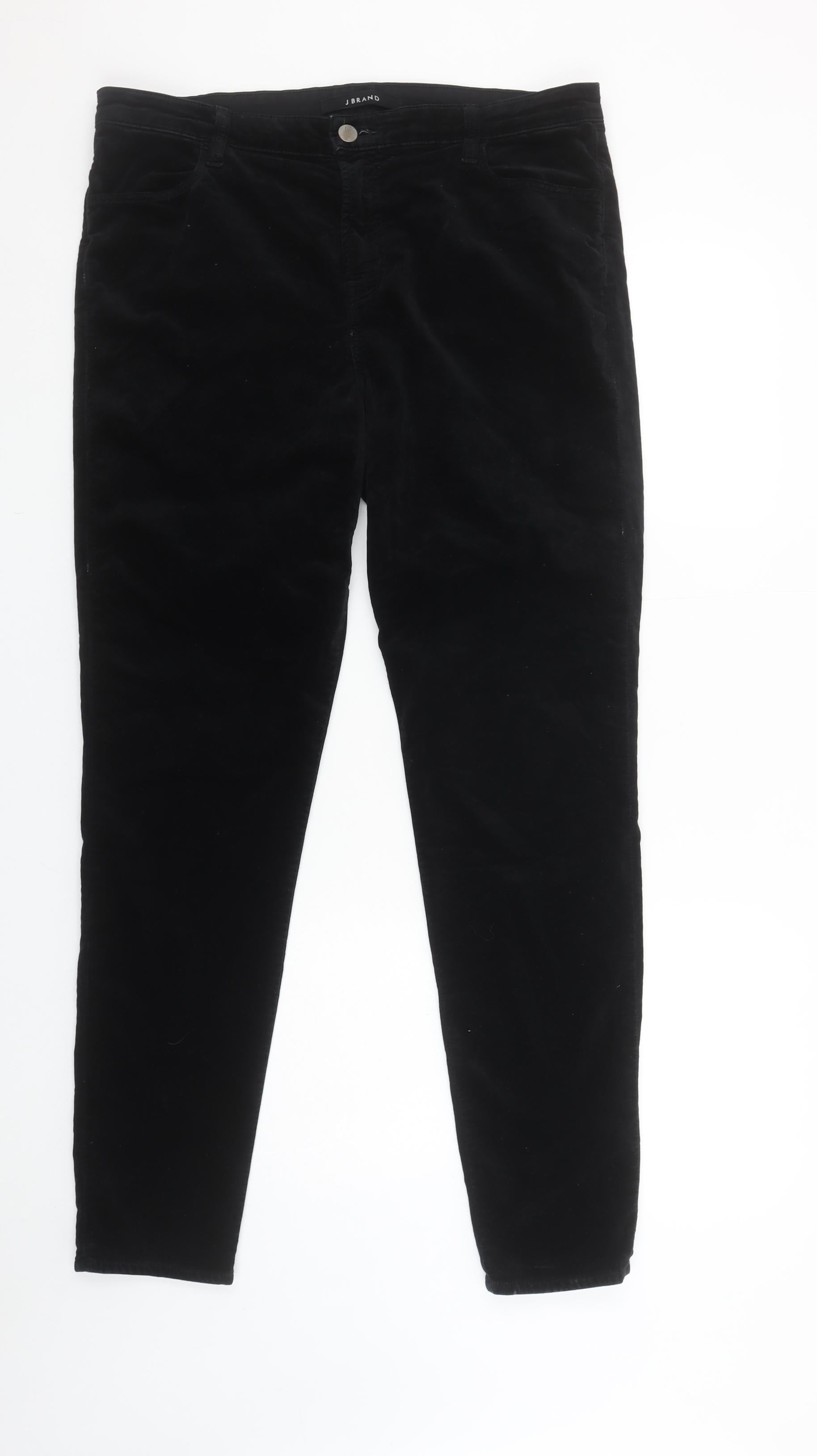 Elevate your wardrobe with these luxurious black velvet skinny trousers from J Brand, a brand known for premium quality and timeless style. Designed for women, these trousers feature a flattering slim fit that contours your figure while ensuring lasting comfort. Crafted from a rich blend of 54% cotton, 35% modal, 8% polyester, and 3% polyurethane, the trousers offer the soft texture of velvet with just the right amount of stretch for ease of movement. The mid-rise waist enhances everyday wearability, while the classic five-pocket styling keeps the look modern and practical. Perfect for casual days out or smart-casual office wear, the black hue provides a versatile base that complements both neutral and bold tops. Pair them with a crisp shirt and heels for an elegant business look, or opt for a cosy jumper and ankle boots for relaxed weekend charm. These trousers close with a sturdy zip and button fastening, ensuring a secure fit. The velvet fabric and snug shape make them ideal for autumn and winter seasons when you want to combine sophistication with warmth. While pre-owned, the condition remains excellent with no visible flaws, ensuring you can enjoy designer quality for a fraction of the price. With their sleek finish and premium material composition, these J Brand trousers embody understated elegance and comfort, making them an ideal addition to any fashion-forward wardrobe.