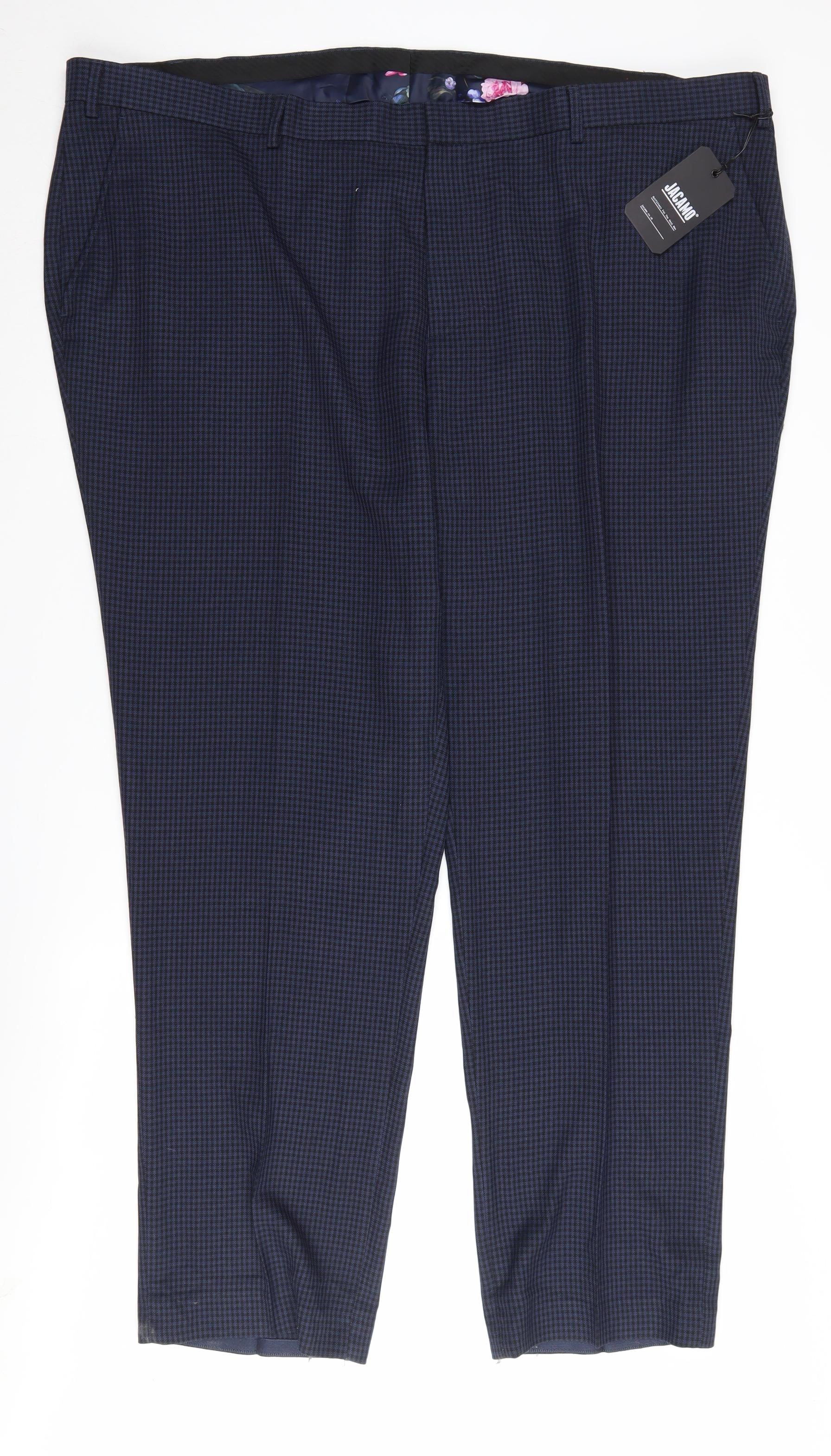 Step up your style game with these classic Jacamo men's trousers in a sophisticated blue check pattern. Designed for those who appreciate timeless fashion with a modern twist, these trousers are perfect for workwear or any formal setting. The regular fit offers comfort without compromising on style, making them a versatile addition to your wardrobe. Crafted from a blend of 68% polyester and 32% viscose, they promise durability and ease of care, ensuring you look sharp through every season. With a traditional flat front design, complemented by button and zip closures, these trousers offer both style and practicality. The rich blue hue and subtle check pattern add a touch of elegance, ideal for pairing with a variety of shirts and jackets. Slight wear marks on the hem suggest prior use, yet these trousers maintain an excellent condition, ready to enhance your smart-casual or formal outfits. Secure these Jacamo trousers today and enjoy a blend of comfort, style, and lasting quality that's hard to beat.