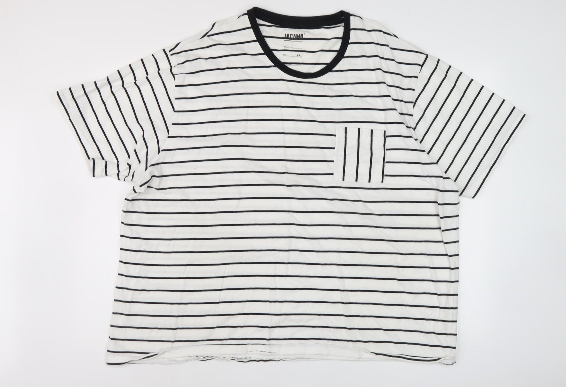 Enhance your casual wardrobe with this stylish Jacamo Men's White Striped T-Shirt. Crafted from soft, breathable cotton, it offers comfort for everyday wear. The classic black and white striped pattern, along with a functional pocket accent, adds a touch of modern flair to this versatile t-shirt. Designed in a short sleeve style and featuring a crew neck, it is perfect for the warm summer months. Whether you're heading to the beach or just running errands, this t-shirt makes an ideal choice for any occasion. Easily paired with jeans or shorts, and convenient to care for with its machine washable fabric, it's a must-have staple in every man's wardrobe. Available in size 2XL, it ensures a comfortable fit for regular builds. The high-quality cotton ensures durability, making it perfect for all-season wear. Add this essential piece to your collection and enjoy a blend of style and comfort with every wear.