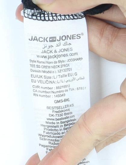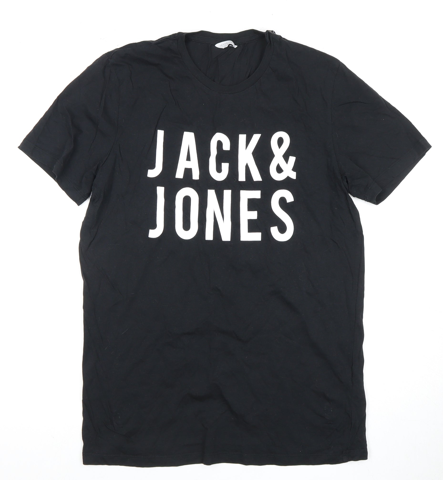 Enhance your wardrobe with this stylish Jack and Jones Men's T-Shirt, crafted from a comfortable blend of cotton and elastane for a snug fit. Perfectly suited for all seasons, this black short sleeve tee features a classic crew neck and a bold logo design, making it a versatile choice for casual outings or layering under jackets. The solid black colour ensures it pairs easily with any outfit, while the machine washable fabric offers easy care. Despite being previously owned, it remains in excellent condition with no visible defects. Discover the perfect blend of style and comfort with this essential wardrobe piece.