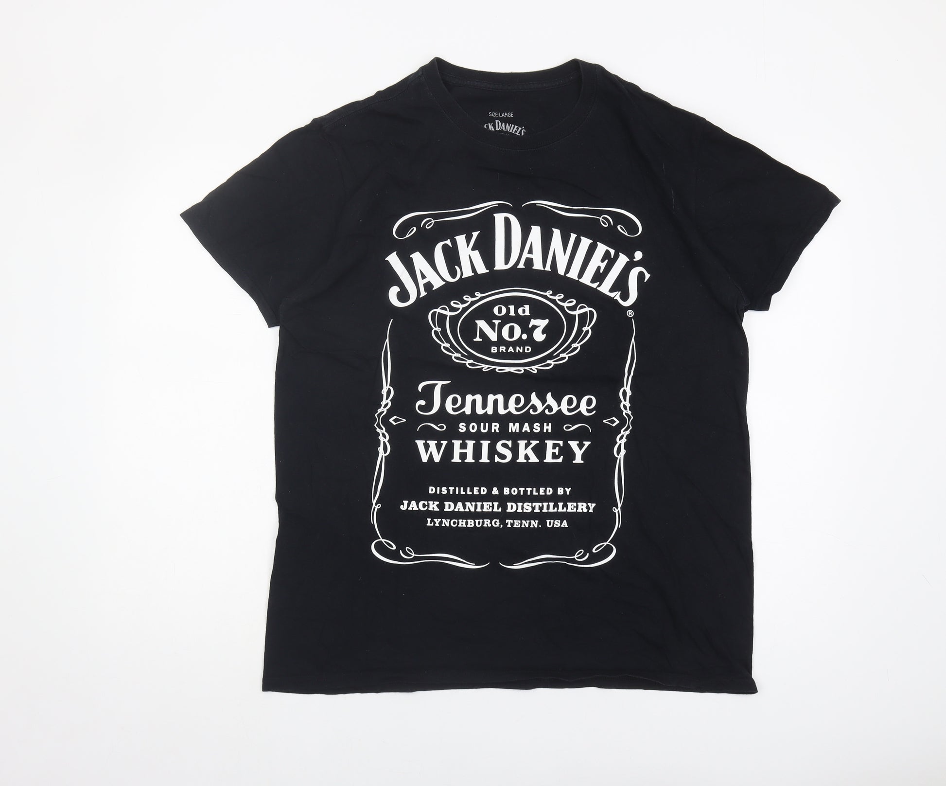 Introducing the Jack Daniel's Men's Black Graphic T-Shirt, a must-have for fans of the iconic whiskey brand. This stylish black tee features the classic Jack Daniel's logo across the front, proudly displaying the Old No. 7 Tennessee Sour Mash Whiskey graphic. Crafted from soft and breathable cotton, this regular fit T-shirt offers comfort and style for any casual occasion. The crew neck and short sleeves make it perfect for layering or wearing on its own during warmer seasons. With its versatile black colour and eye-catching print, it pairs effortlessly with jeans, shorts, or a casual jacket. Ideal for summer parties, concerts, or simply relaxing, this T-shirt celebrates the legendary Jack Daniel's heritage. Elevate your wardrobe with this unique piece that combines comfort with a touch of rebellion. Machine washable for easy care, it's designed to withstand frequent wear. Available in size L, it's perfect for any Jack Daniel's enthusiast or anyone who appreciates a classic graphic tee. Grab yours now and showcase your love for a timeless American whiskey.