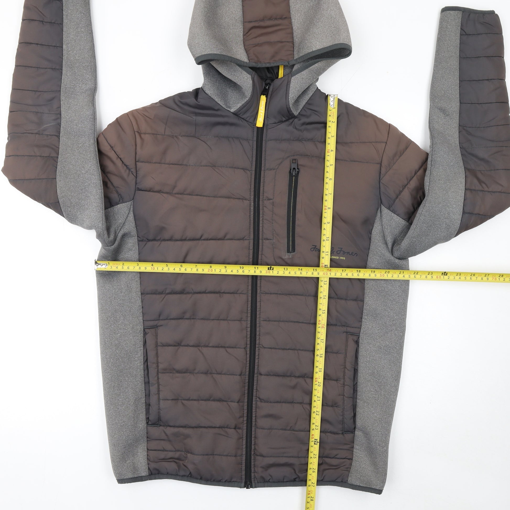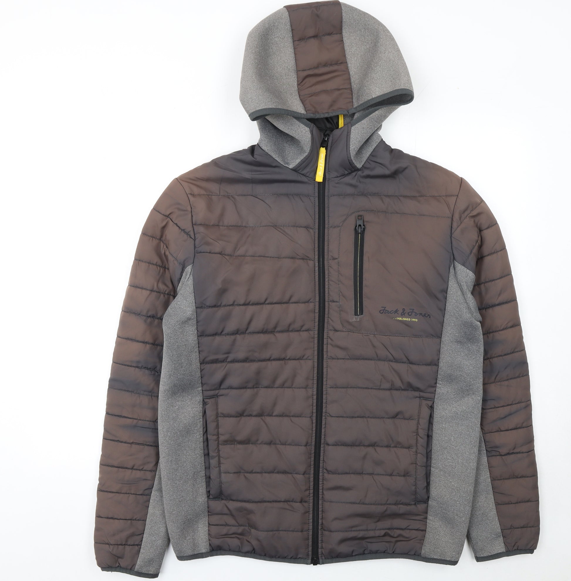 Stay warm and comfortable in this stylish Jack & Jones men's hooded puffer jacket. Designed for versatile wear, this piece combines practicality with a sleek modern aesthetic. Crafted from 100% polyester, the softshell-style fabric provides light insulation, offering protection against cooler autumn and winter conditions. The soft yet durable material ensures a comfortable fit that maintains its shape and warmth through everyday wear. The jacket features a lined interior for added warmth, and its full zip front closure allows for easy layering. With three convenient zipper pockets, including a chest pocket for secure storage, it’s ideal for on-the-go convenience. The hooded design adds practical coverage from wind and rain, making it perfect for outdoor walks, casual outings, or travelling. This jacket’s minimalist grey tone pairs effortlessly with jeans, joggers or chinos, giving it a clean, classic appearance suitable for a wide range of occasions. Subtle Jack & Jones branding on the chest adds a refined finishing touch without overwhelming the design. This lightweight outerwear piece captures the ideal balance between functionality and fashion, offering warmth without bulk. Cut in a regular fit, the jacket ensures freedom of movement and relaxed style. The durable zip fastenings and binding at the cuffs and hem provide a neat, finished look while helping to lock in warmth. Suitable for casual, travel, and outdoor settings, this Jack & Jones puffer jacket is a must-have for the cooler months. In excellent pre-owned condition with no significant signs of wear, it delivers both comfort and quality craftsmanship at a great price. Ideal for layering over a hoodie or knitwear, this men’s puffer jacket is the perfect companion for brisk autumn mornings and cool winter days. A smart, contemporary jacket for everyday wear that combines insulation, practicality, and timeless design.