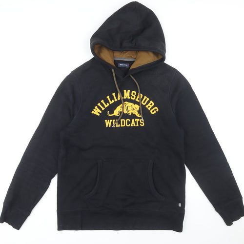 Experience a blend of style and comfort with this Jack & Jones men's hoodie. Crafted in a classic pullover style, the hoodie features a striking black colour that makes it versatile for any outfit. The graphic print logo on the front proudly displays the 'Williamsburg Wildcats', adding a sporty and collegiate theme to your wardrobe. Constructed from a soft knit fabric composed of 80% cotton and 20% polyester, this hoodie is designed to keep you warm throughout autumn and winter seasons. Its regular fit ensures a comfortable wear, complete with a convenient drawstring closure at the hood for a snug fit. This men's hoodie is both practical and stylish, featuring additional elements such as a functional front pocket, perfect for keeping your hands warm or storing small essentials. While the condition is noted as excellent with slight wear, it lacks original sales tags. Easy to care for, this hoodie is machine washable, making it simple to maintain. Ideal for casual outings or lounging at home, this hoodie suits a relaxed lifestyle. Add a versatile piece to your collection with this stylish hoodie, perfect for those who appreciate a mix of comfort, functionality, and classic style.